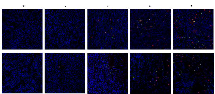 CD3E was detected in a paraffin-embedded section of mouse 4T1 cell xenograft tumor tissue. Heat mediated antigen retrieval was performed in EDTA buffer (pH 8.0, epitope retrieval solution). The tissue section was blocked with 10% goat serum. The tissue section was then incubated with 1:200 rabbit anti-CD3E Antibody (PB9093) overnight at 4°C. DyLight 550-conjugated Goat Anti-Rabbit was used as secondary antibody incubated for 1 hour at RT. The section was counterstained with DAPI. Visualize using a fluorescence microscope and filter sets appropriate for the label used.