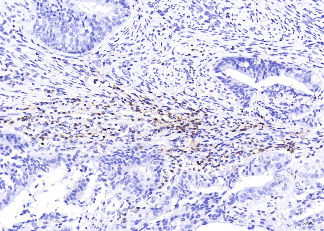 | Results Summary | CD4 is a marker of helper T cells; in this IHC experiment, CD4 staining clearly identified helper T cells in human cervical cancer samples, showing excellent specificity and performance of the antibody. |
