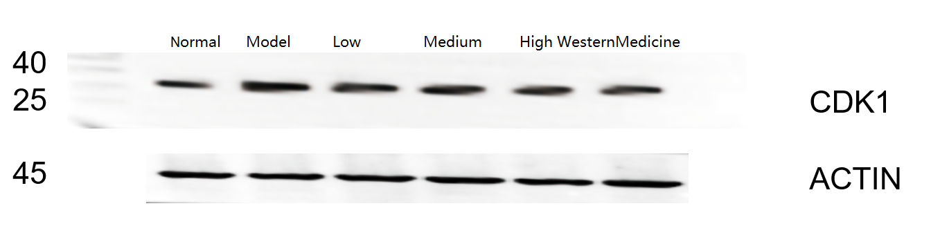 | Results Summary | The image shows WB results of CDK1 and the loading control Actin in rat colon across different groups; CDK1 expression was elevated in the model group and most effectively reduced in the high-dose herbal treatment group, with clear and distinct target bands. |