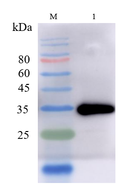 Electrophoresis was performed on a 10% SDS-PAGE gel at 80V (Stacking gel) / 120V (Resolving gel) for 2 hours. The sample well of each lane was loaded with 30 ug of sample under reducing conditions.