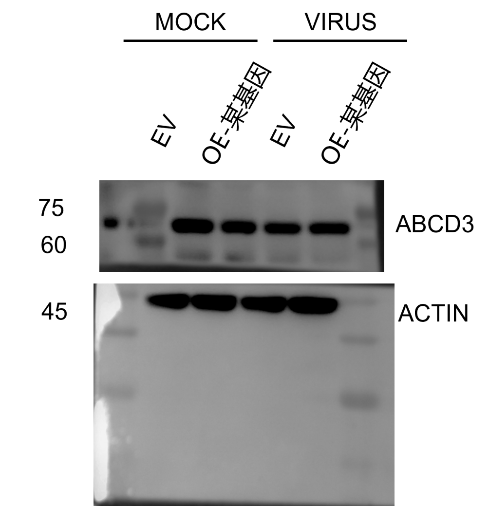 | Results Summary | The figure shows a schematic representation of Western blot results for ABCD3 and the internal control Actin in MARC-145 cells under normal and toxin-treated conditions. The target bands are clear and well-defined, and the experimental results are satisfactory. |