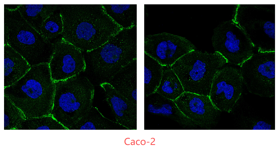 | Results Summary | Caco-2 cells are a “gold standard” in vitro model for studying intestinal epithelial function, and ZO-1 is a key marker of barrier integrity. The images show immunofluorescence staining of ZO-1 in normally cultured Caco-2 cells to evaluate antibody performance. Clear membrane localization and accurate staining indicate that this antibody is suitable for downstream research applications. |