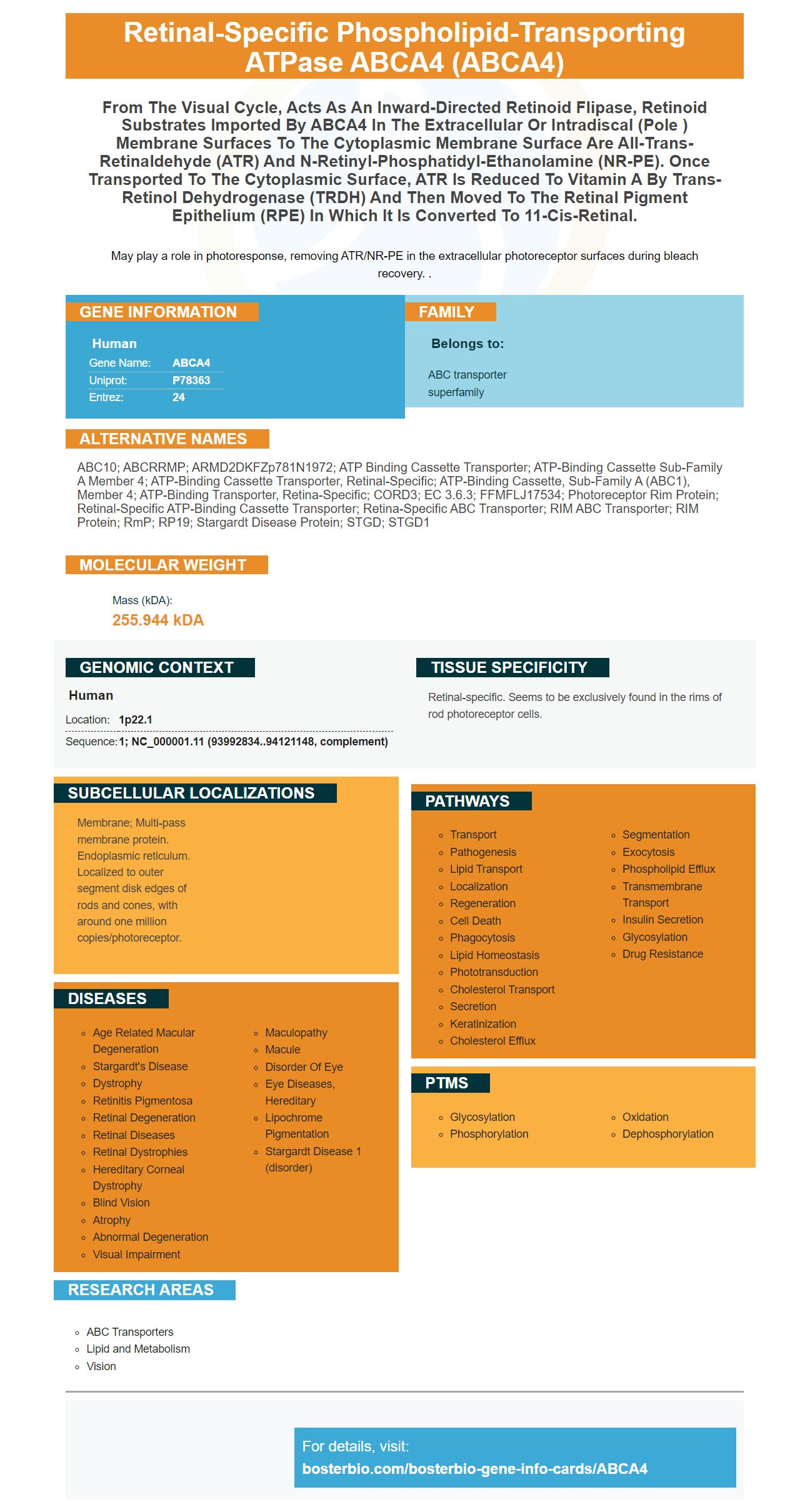 ABC10; ABCRRMP; ARMD2DKFZp781N1972; ATP binding cassette transporter; ATP-binding cassette sub-family A member 4; ATP-binding cassette transporter, retinal-specific; ATP-binding cassette, sub-family A (ABC1), member 4; ATP-binding transporter, retina-specific; CORD3; EC 3.6.3; FFMFLJ17534; photoreceptor rim protein; retinal-specific ATP-binding cassette transporter; retina-specific ABC transporter; RIM ABC transporter; RIM protein; RmP; RP19; Stargardt disease protein; STGD; STGD1