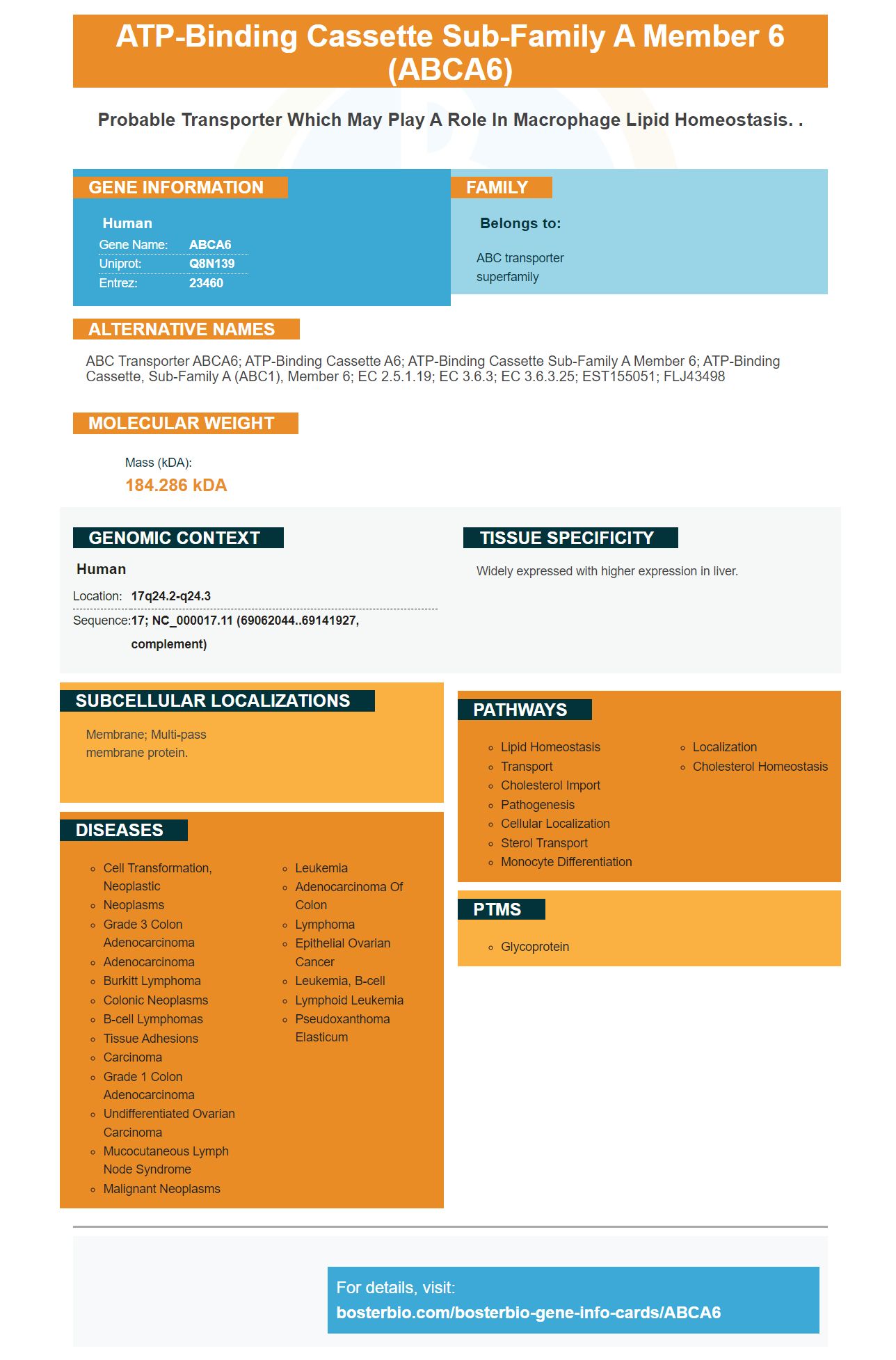 ABC transporter ABCA6; ATP-binding cassette A6; ATP-binding cassette sub-family A member 6; ATP-binding cassette, sub-family A (ABC1), member 6; EC 2.5.1.19; EC 3.6.3; EC 3.6.3.25; EST155051; FLJ43498