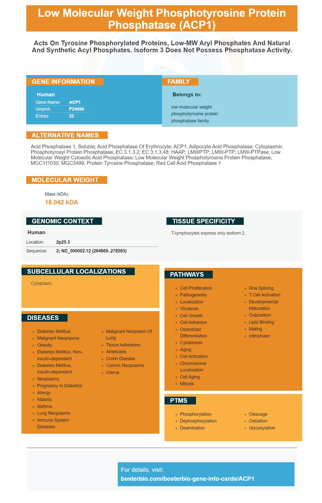 acid phosphatase 1, soluble; acid phosphatase of erythrocyte; ACP1; Adipocyte acid phosphatase; cytoplasmic phosphotyrosyl protein phosphatase; EC 3.1.3.2; EC 3.1.3.48; HAAP; LMWPTP; LMW-PTP; LMW-PTPase; Low molecular weight cytosolic acid phosphatase; low molecular weight phosphotyrosine protein phosphatase; MGC111030; MGC3499; protein tyrosine phosphatase; Red cell acid phosphatase 1