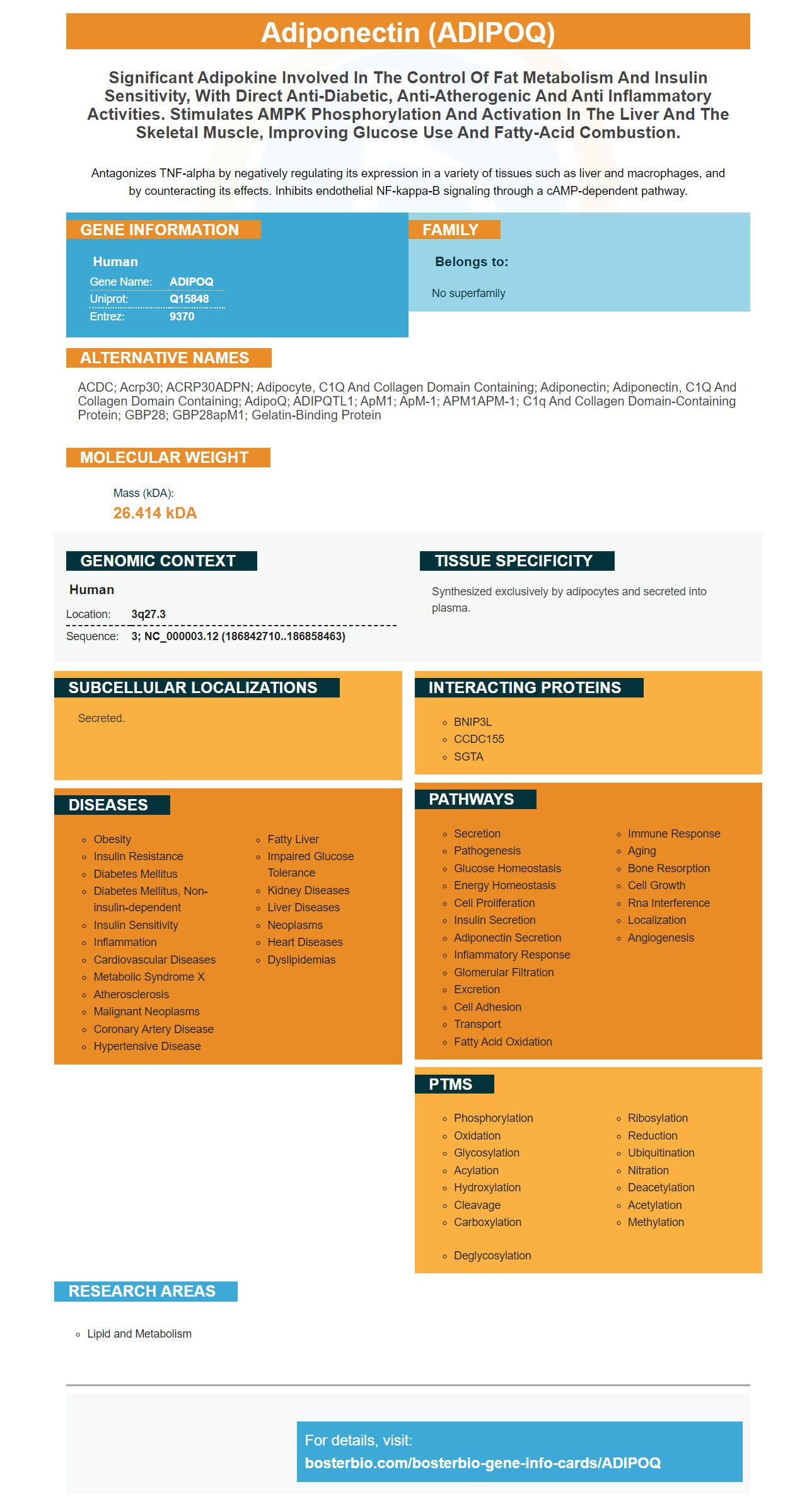 ACDC; Acrp30; ACRP30ADPN; adipocyte, C1Q and collagen domain containing; Adiponectin; adiponectin, C1Q and collagen domain containing; AdipoQ; ADIPQTL1; ApM1; apM-1; APM1APM-1; C1q and collagen domain-containing protein; GBP28; GBP28apM1; Gelatin-binding protein