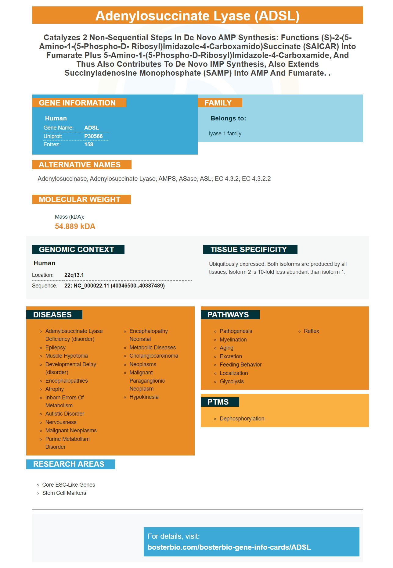 PMID: 10888601 by Kmoch S., et al. Human adenylosuccinate lyase (ADSL), cloning and characterization of full-length cDNA and its isoform, gene structure and molecular basis for ADSL deficiency in six patients.