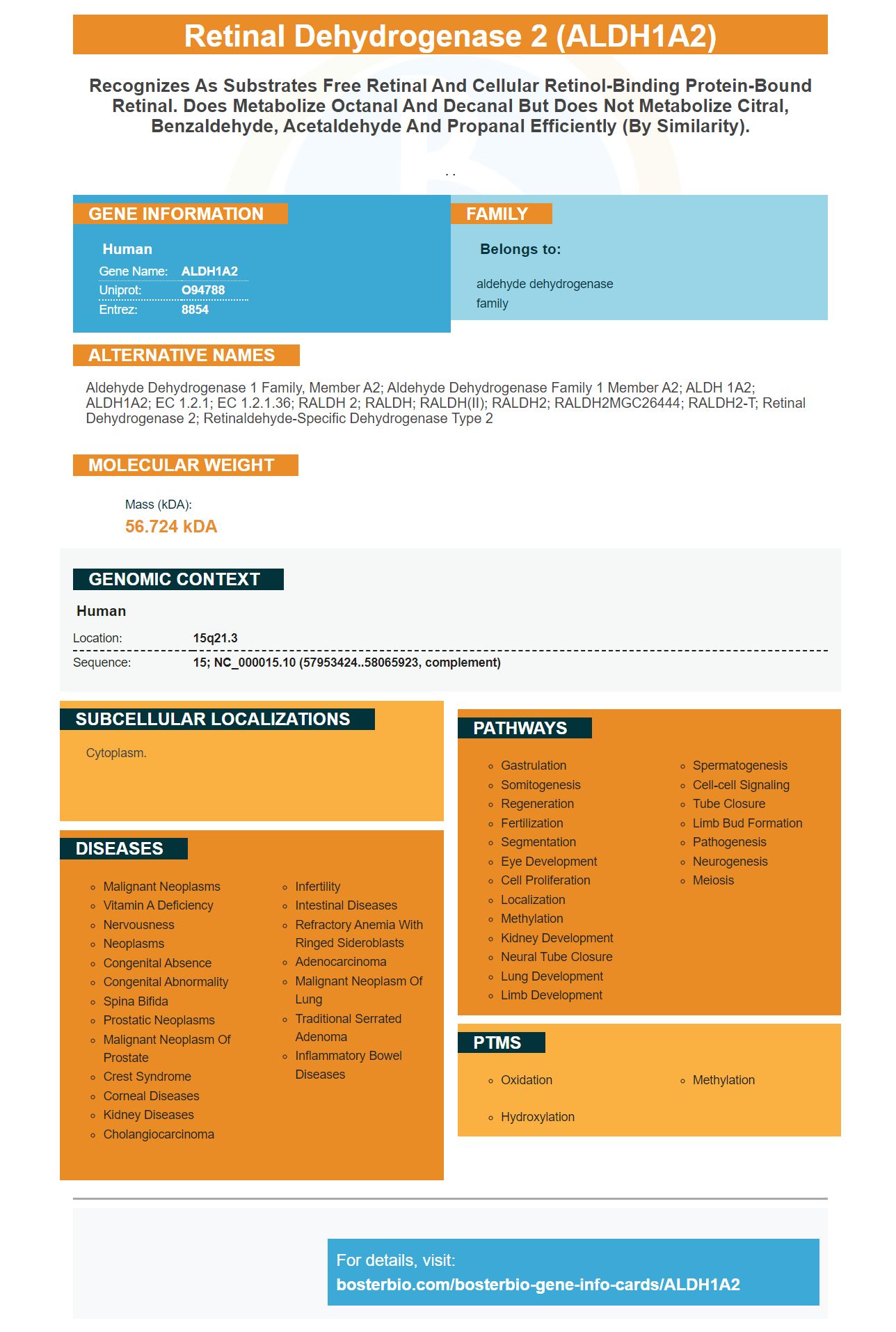 aldehyde dehydrogenase 1 family, member A2; Aldehyde dehydrogenase family 1 member A2; ALDH 1A2; ALDH1A2; EC 1.2.1; EC 1.2.1.36; RALDH 2; RALDH; RALDH(II); RALDH2; RALDH2MGC26444; RALDH2-T; retinal dehydrogenase 2; Retinaldehyde-specific dehydrogenase type 2