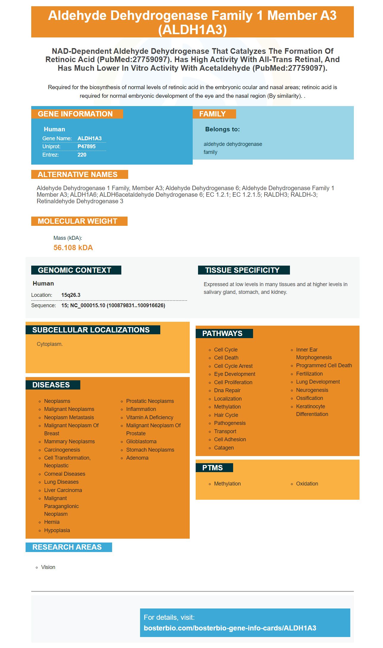 aldehyde dehydrogenase 1 family, member A3; Aldehyde dehydrogenase 6; aldehyde dehydrogenase family 1 member A3; ALDH1A6; ALDH6acetaldehyde dehydrogenase 6; EC 1.2.1; EC 1.2.1.5; RALDH3; RALDH-3; Retinaldehyde dehydrogenase 3
