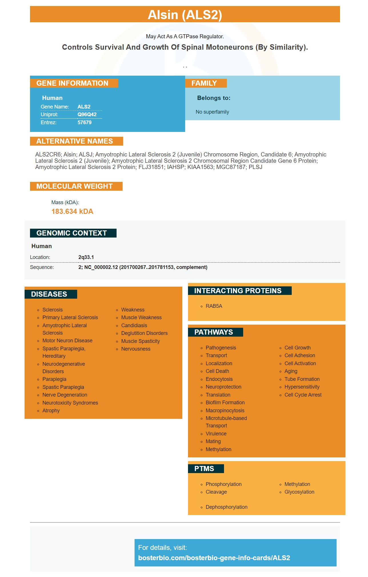 ALS2CR6; alsin; ALSJ; amyotrophic lateral sclerosis 2 (juvenile) chromosome region, candidate 6; amyotrophic lateral sclerosis 2 (juvenile); Amyotrophic lateral sclerosis 2 chromosomal region candidate gene 6 protein; Amyotrophic lateral sclerosis 2 protein; FLJ31851; IAHSP; KIAA1563; MGC87187; PLSJ