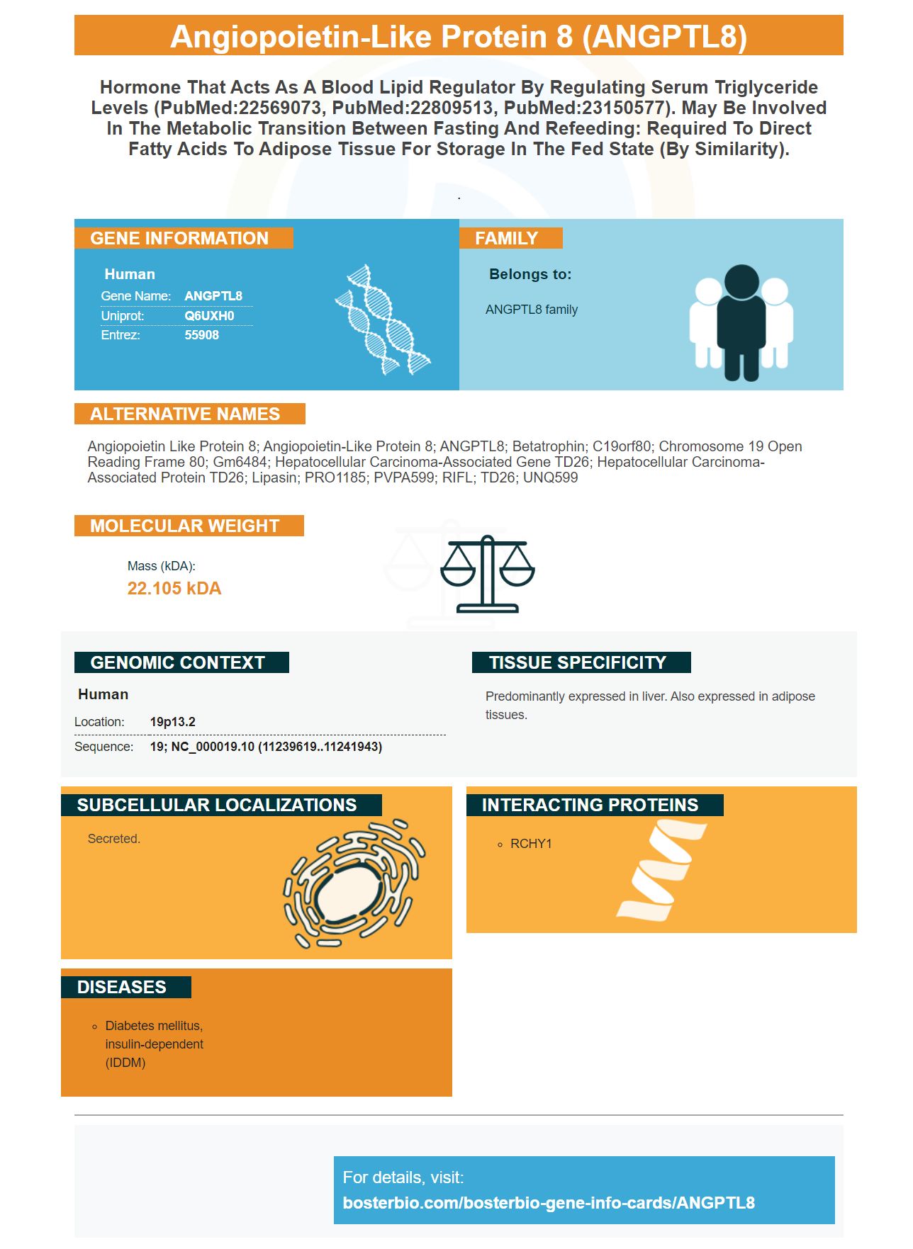 Angiopoietin like Protein 8; Angiopoietin-like Protein 8; ANGPTL8; Betatrophin; C19orf80; chromosome 19 open reading frame 80; Gm6484; hepatocellular carcinoma-associated gene TD26; hepatocellular carcinoma-associated protein TD26; Lipasin; PRO1185; PVPA599; RIFL; TD26; UNQ599