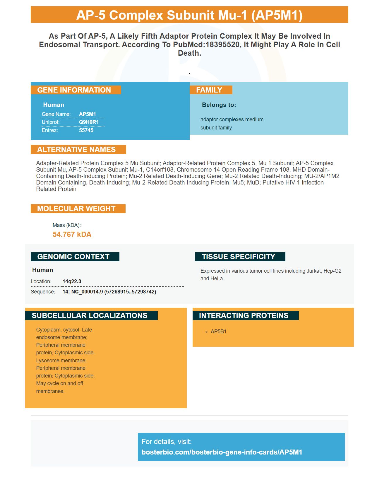 Adapter-Related Protein Complex 5 Mu Subunit; Adaptor-Related Protein Complex 5, Mu 1 Subunit; AP-5 Complex Subunit Mu; AP-5 Complex Subunit Mu-1; C14orf108; Chromosome 14 Open Reading Frame 108; MHD Domain-Containing Death-Inducing Protein; Mu-2 Related Death-Inducing Gene; Mu-2 Related Death-Inducing; MU-2/AP1M2 Domain Containing, Death-Inducing; Mu-2-Related Death-Inducing Protein; Mu5; MuD; Putative HIV-1 Infection-Related Protein