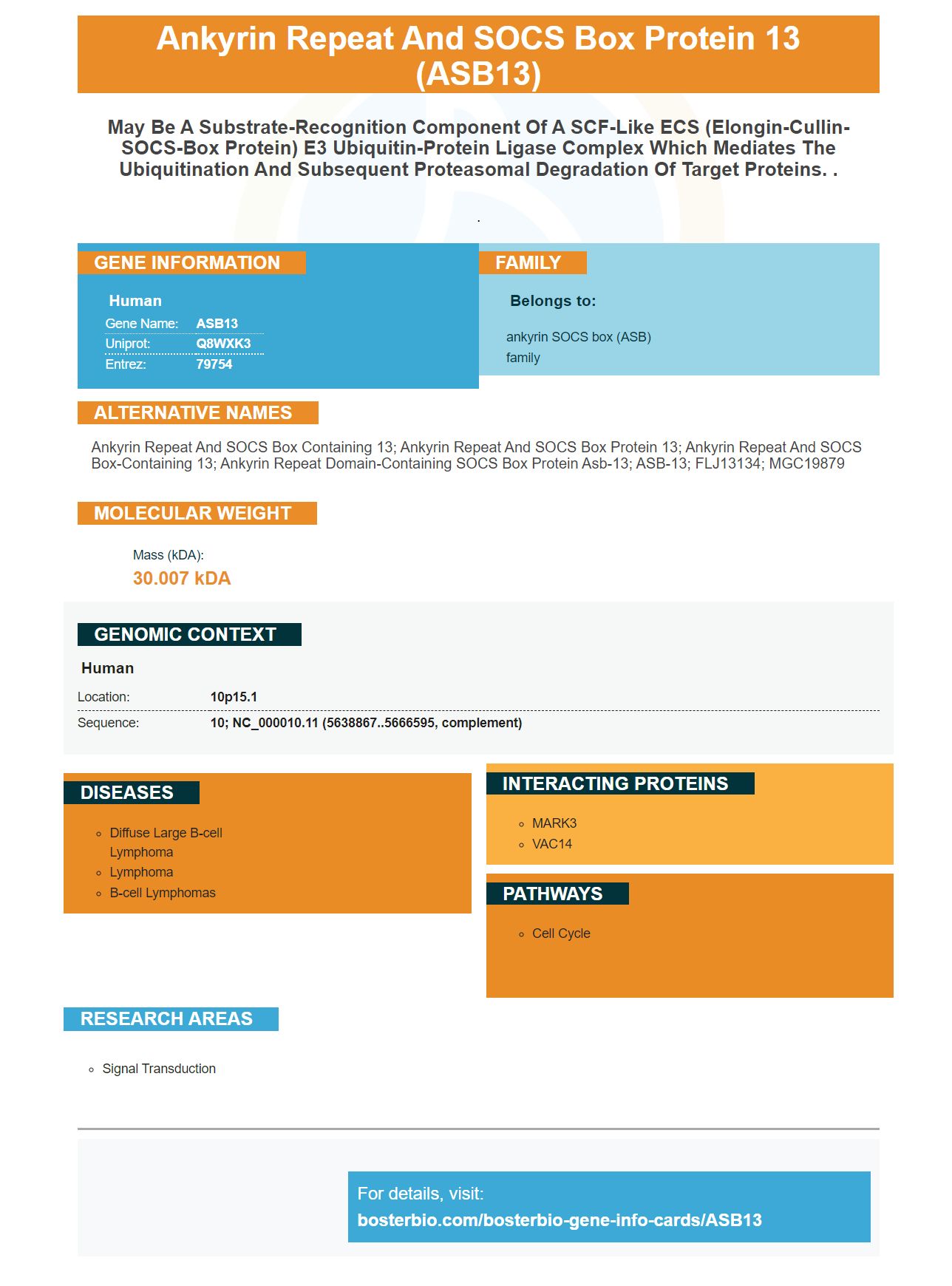 ankyrin repeat and SOCS box containing 13; ankyrin repeat and SOCS box protein 13; ankyrin repeat and SOCS box-containing 13; ankyrin repeat domain-containing SOCS box protein Asb-13; ASB-13; FLJ13134; MGC19879