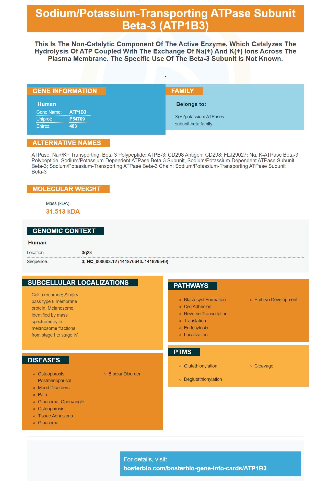 ATPase, Na+/K+ transporting, beta 3 polypeptide; ATPB-3; CD298 antigen; CD298; FLJ29027; Na, K-ATPase beta-3 polypeptide; sodium/potassium-dependent ATPase beta-3 subunit; Sodium/potassium-dependent ATPase subunit beta-3; sodium/potassium-transporting ATPase beta-3 chain; sodium/potassium-transporting ATPase subunit beta-3