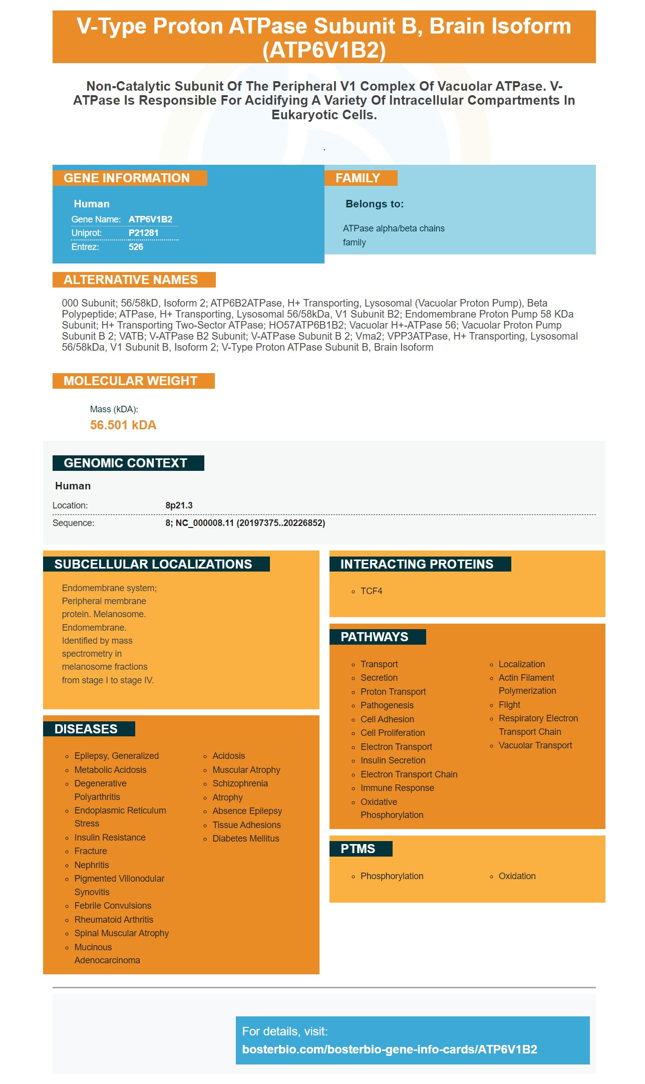 000 subunit; 56/58kD, isoform 2; ATP6B2ATPase, H+ transporting, lysosomal (vacuolar proton pump), beta polypeptide; ATPase, H+ transporting, lysosomal 56/58kDa, V1 subunit B2; Endomembrane proton pump 58 kDa subunit; H+ transporting two-sector ATPase; HO57ATP6B1B2; vacuolar H+-ATPase 56; Vacuolar proton pump subunit B 2; VATB; V-ATPase B2 subunit; V-ATPase subunit B 2; Vma2; VPP3ATPase, H+ transporting, lysosomal 56/58kDa, V1 subunit B, isoform 2; V-type proton ATPase subunit B, brain isoform