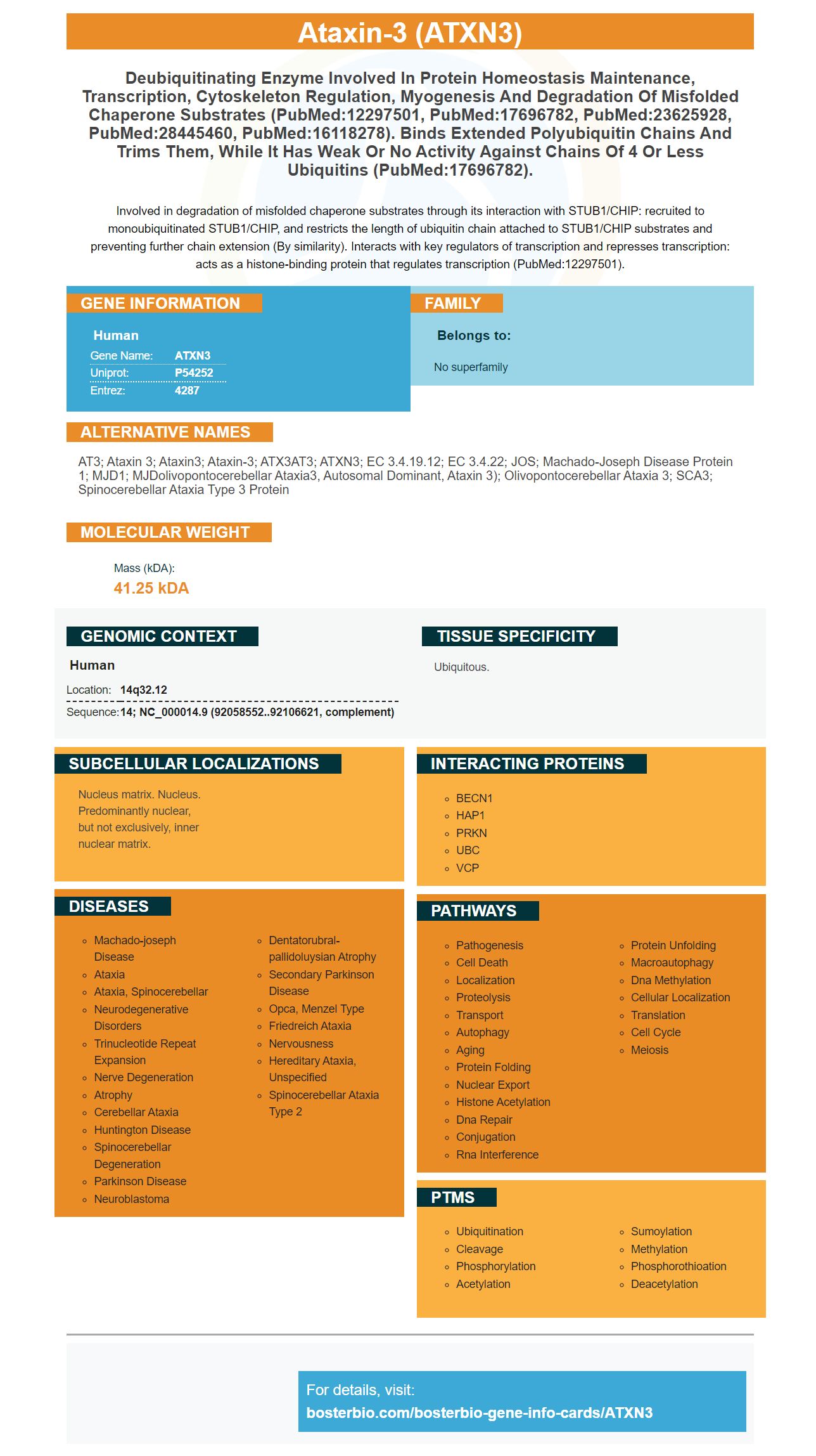 AT3; ataxin 3; Ataxin3; Ataxin-3; ATX3AT3; ATXN3; EC 3.4.19.12; EC 3.4.22; JOS; Machado-Joseph disease protein 1; MJD1; MJDolivopontocerebellar ataxia3, autosomal dominant, ataxin 3); olivopontocerebellar ataxia 3; SCA3; Spinocerebellar ataxia type 3 protein