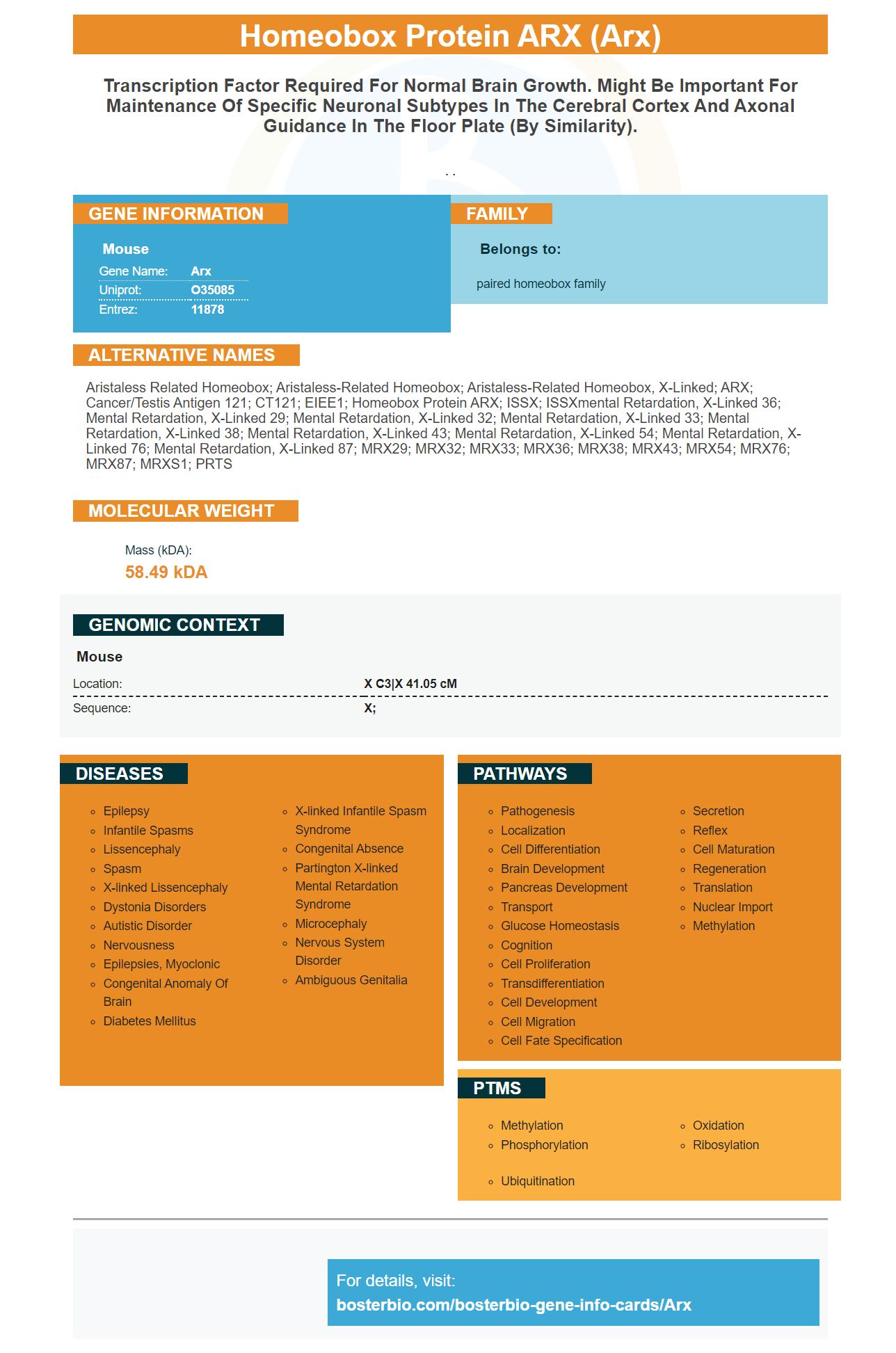 aristaless related homeobox; Aristaless-related homeobox; aristaless-related homeobox, X-linked; ARX; cancer/testis antigen 121; CT121; EIEE1; homeobox protein ARX; ISSX; ISSXmental retardation, X-linked 36; mental retardation, X-linked 29; mental retardation, X-linked 32; mental retardation, X-linked 33; mental retardation, X-linked 38; mental retardation, X-linked 43; mental retardation, X-linked 54; mental retardation, X-linked 76; mental retardation, X-linked 87; MRX29; MRX32; MRX33; MRX36; MRX38; MRX43; MRX54; MRX76; MRX87; MRXS1; PRTS