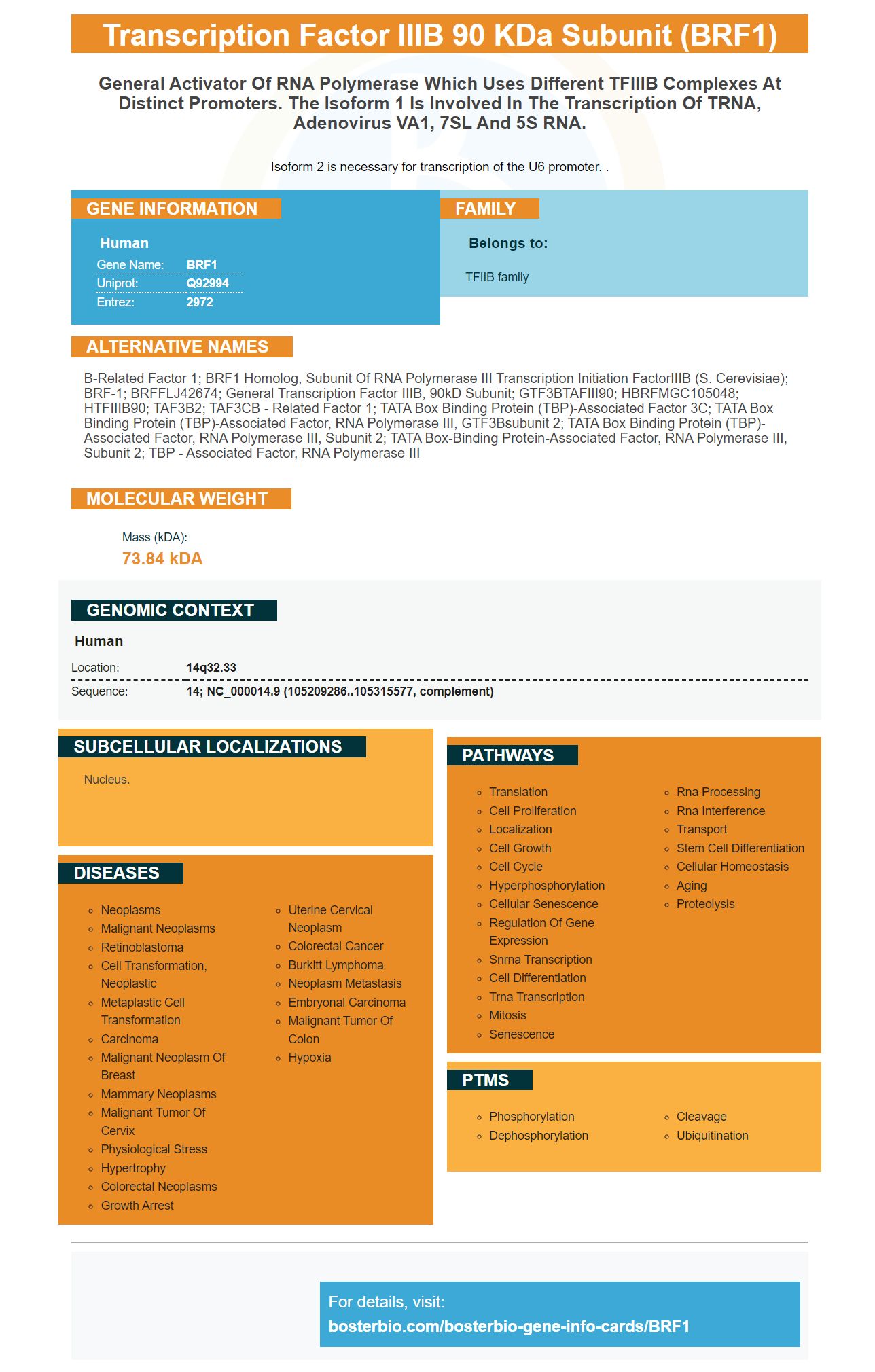 B-related factor 1; BRF1 homolog, subunit of RNA polymerase III transcription initiation factorIIIB (S. cerevisiae); BRF-1; BRFFLJ42674; general transcription factor IIIB, 90kD subunit; GTF3BTAFIII90; hBRFMGC105048; hTFIIIB90; TAF3B2; TAF3CB - related factor 1; TATA box binding protein (TBP)-associated factor 3C; TATA box binding protein (TBP)-associated factor, RNA polymerase III, GTF3Bsubunit 2; TATA box binding protein (TBP)-associated factor, RNA polymerase III, subunit 2; TATA box-binding protein-associated factor, RNA polymerase III, subunit 2; TBP - associated factor, RNA polymerase III