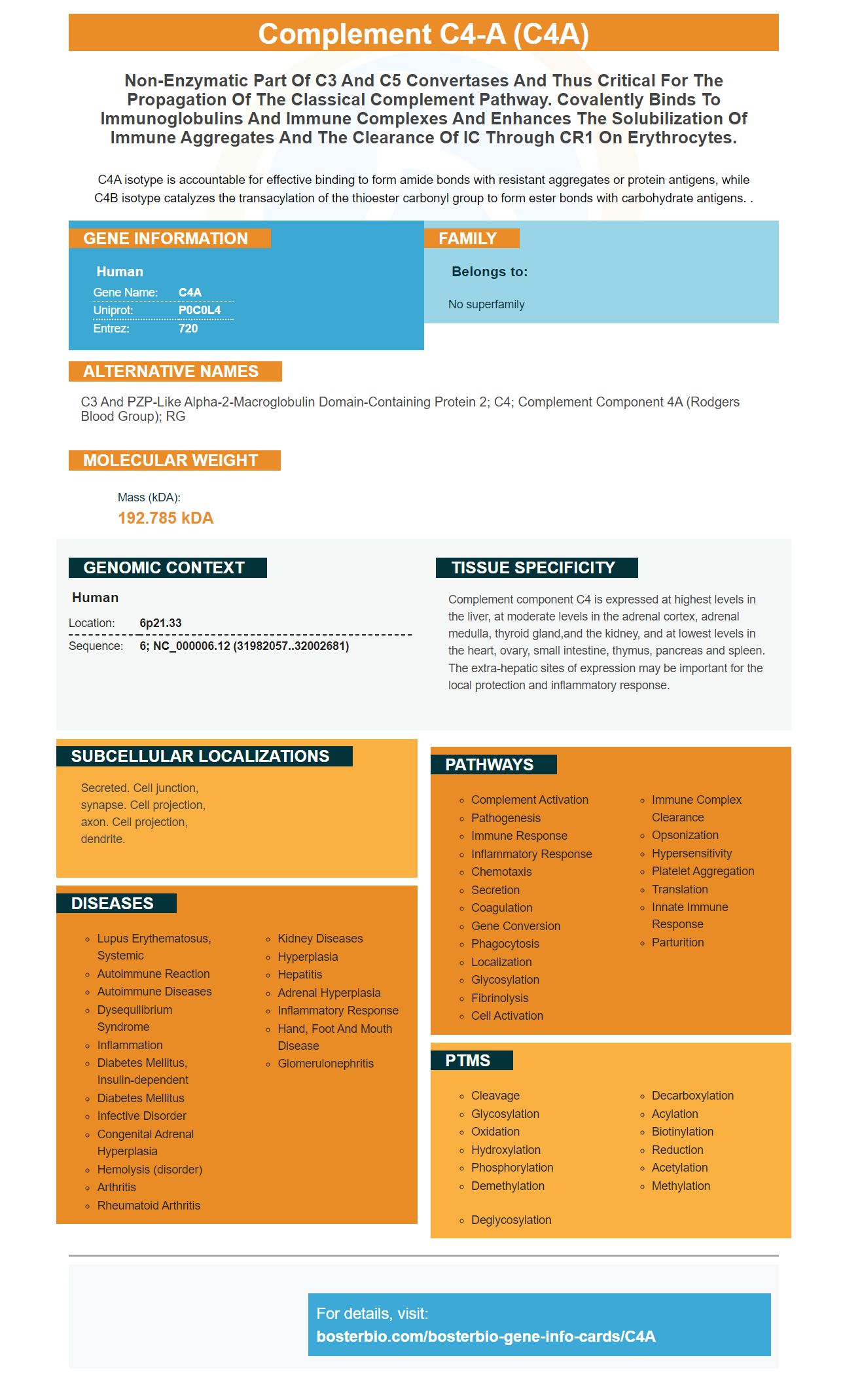 Complement component C4 is expressed at highest levels in the liver, at moderate levels in the adrenal cortex, adrenal medulla, thyroid gland,and the kidney, and at lowest levels in the heart, ovary, small intestine, thymus, pancreas and spleen. The extra-hepatic sites of expression may be important for the local protection and inflammatory response.