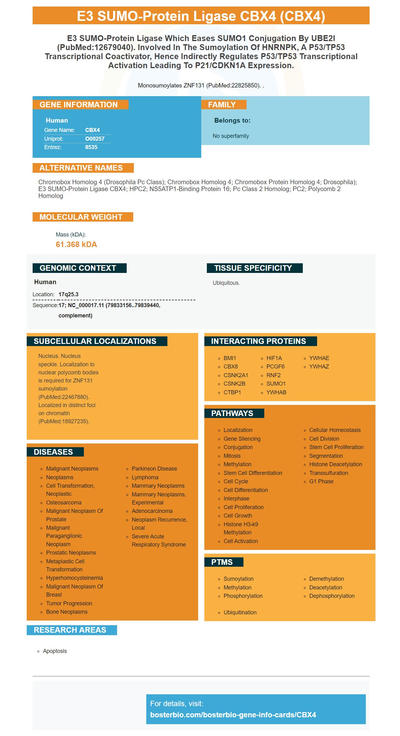 chromobox homolog 4 (Drosophila Pc class); chromobox homolog 4; Chromobox protein homolog 4; Drosophila); E3 SUMO-protein ligase CBX4; hPC2; NS5ATP1-binding protein 16; Pc class 2 homolog; PC2; Polycomb 2 homolog
