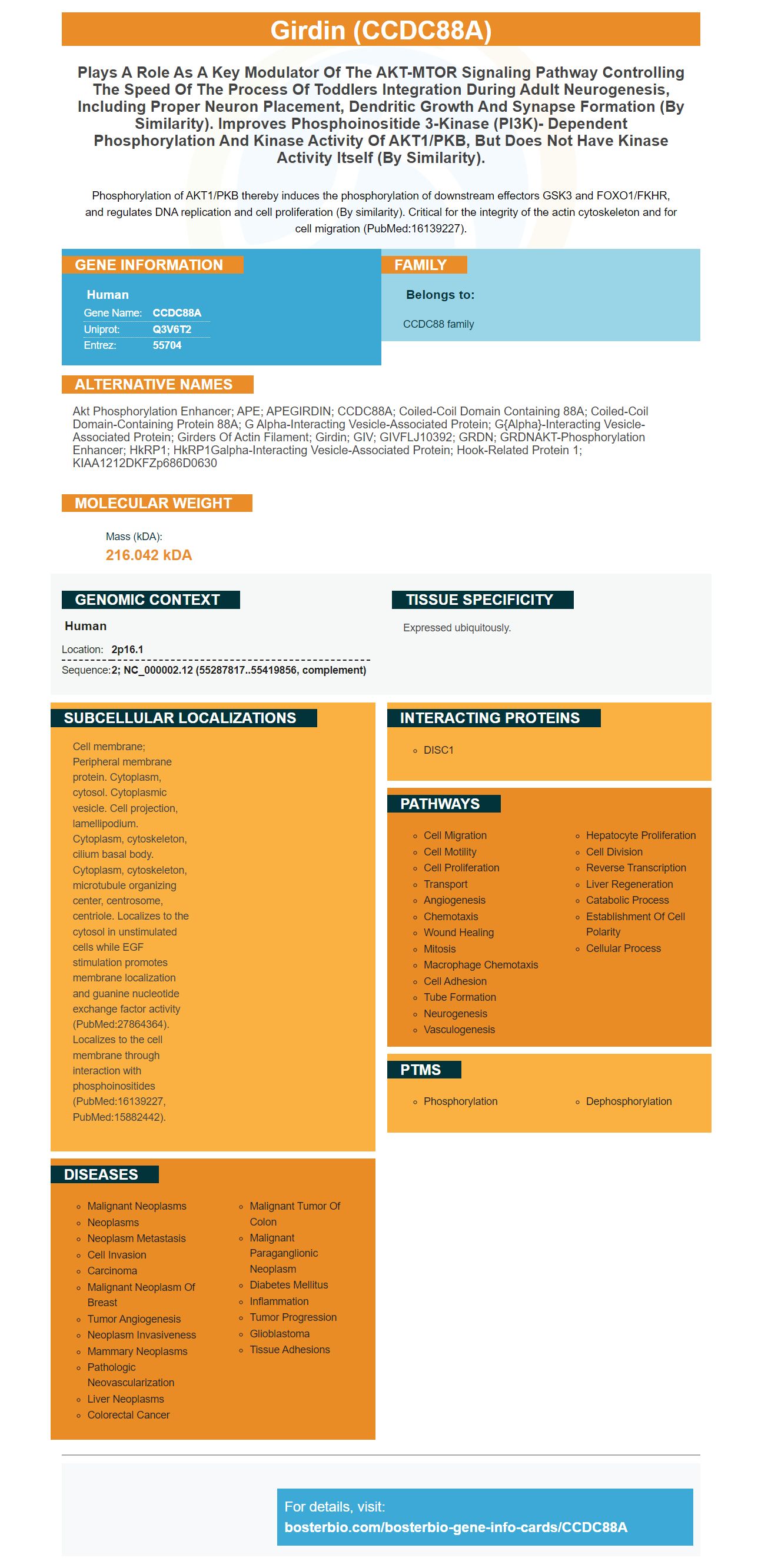 Akt phosphorylation enhancer; APE; APEGIRDIN; CCDC88A; coiled-coil domain containing 88A; Coiled-coil domain-containing protein 88A; G alpha-interacting vesicle-associated protein; G{alpha}-interacting vesicle-associated protein; Girders of actin filament; Girdin; GIV; GIVFLJ10392; GRDN; GRDNAKT-phosphorylation enhancer; HkRP1; HkRP1Galpha-interacting vesicle-associated protein; Hook-related protein 1; KIAA1212DKFZp686D0630