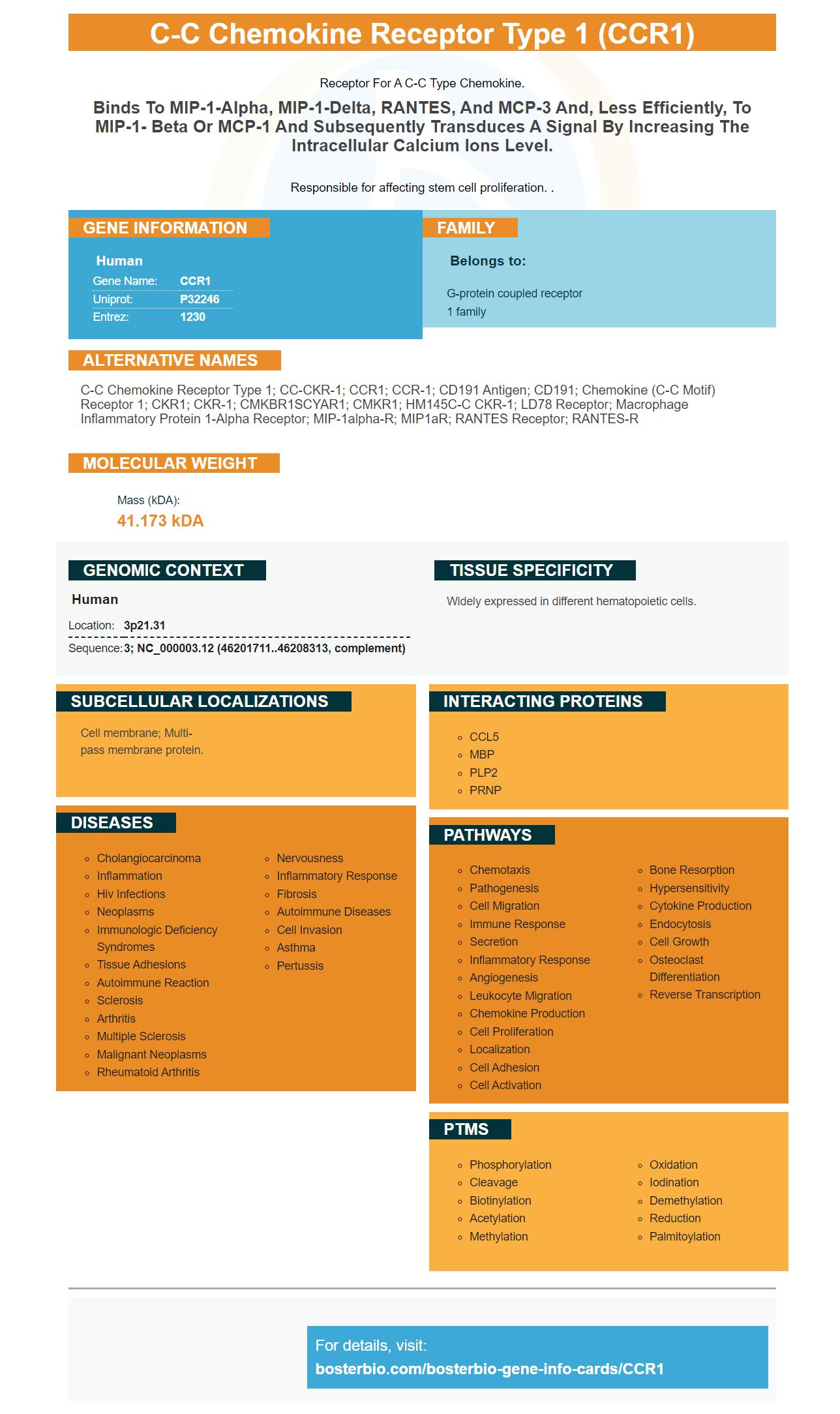 C-C chemokine receptor type 1; CC-CKR-1; CCR1; CCR-1; CD191 antigen; CD191; chemokine (C-C motif) receptor 1; CKR1; CKR-1; CMKBR1SCYAR1; CMKR1; HM145C-C CKR-1; LD78 receptor; Macrophage inflammatory protein 1-alpha receptor; MIP-1alpha-R; MIP1aR; RANTES receptor; RANTES-R