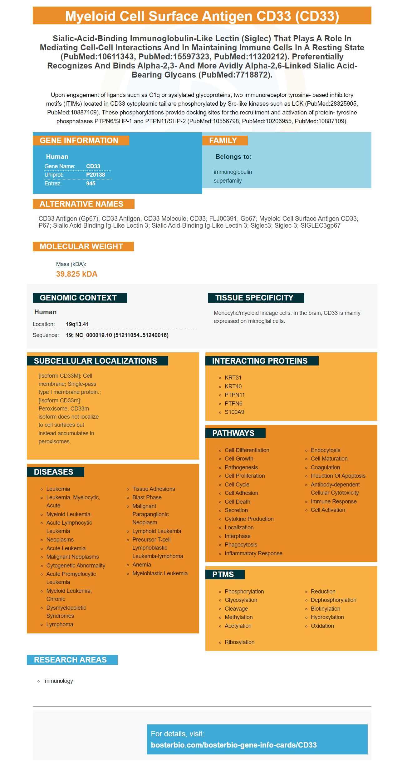 CD33 antigen (gp67); CD33 antigen; CD33 molecule; CD33; FLJ00391; gp67; myeloid cell surface antigen CD33; p67; sialic acid binding Ig-like lectin 3; Sialic acid-binding Ig-like lectin 3; Siglec3; Siglec-3; SIGLEC3gp67