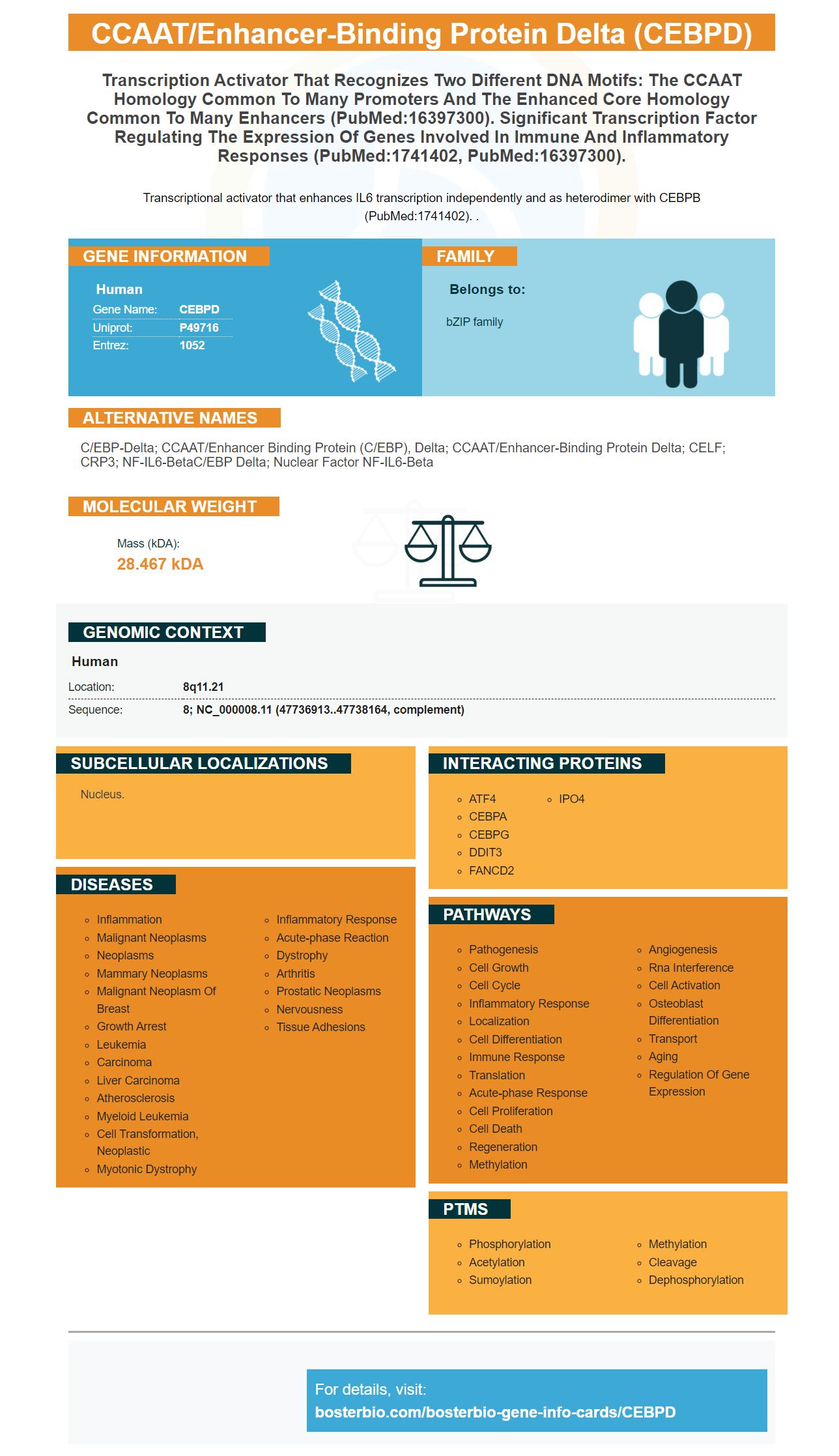 C/EBP-delta; CCAAT/enhancer binding protein (C/EBP), delta; CCAAT/enhancer-binding protein delta; CELF; CRP3; NF-IL6-betaC/EBP delta; Nuclear factor NF-IL6-beta
