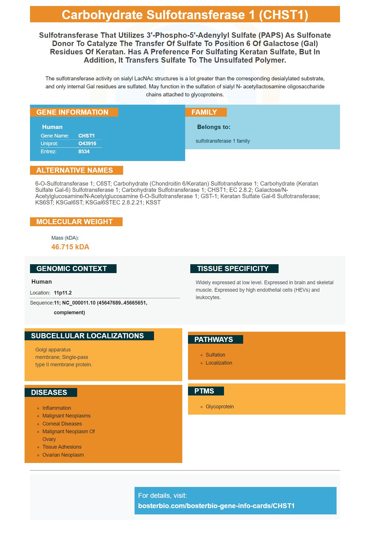 6-O-sulfotransferase 1; C6ST; carbohydrate (chondroitin 6/keratan) sulfotransferase 1; carbohydrate (keratan sulfate Gal-6) sulfotransferase 1; Carbohydrate Sulfotransferase 1; CHST1; EC 2.8.2; Galactose/N-acetylglucosamine/N-acetylglucosamine 6-O-sulfotransferase 1; GST-1; Keratan sulfate Gal-6 sulfotransferase; KS6ST; KSGal6ST; KSGal6STEC 2.8.2.21; KSST