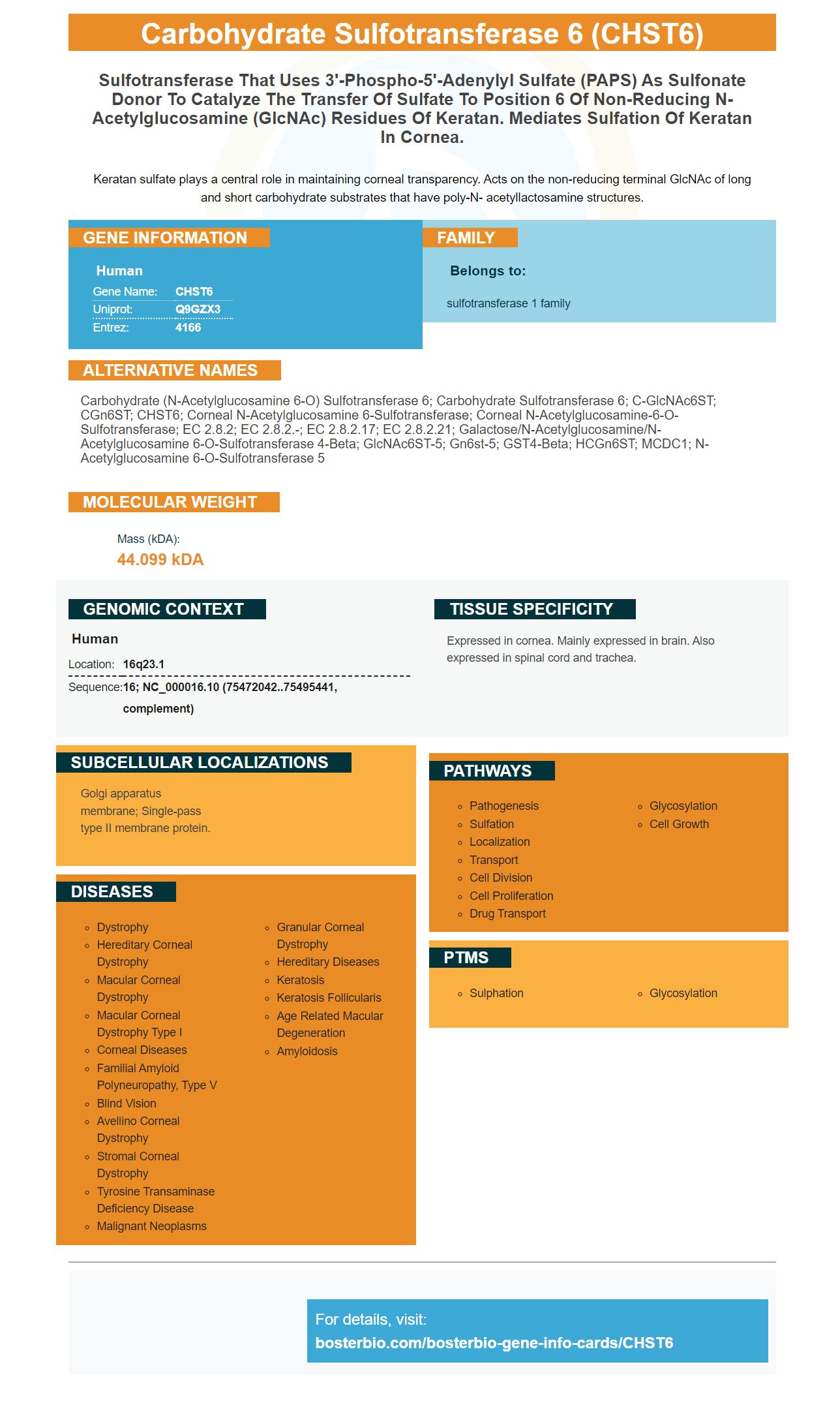 carbohydrate (N-acetylglucosamine 6-O) sulfotransferase 6; Carbohydrate Sulfotransferase 6; C-GlcNAc6ST; CGn6ST; CHST6; corneal N-acetylglucosamine 6-sulfotransferase; Corneal N-acetylglucosamine-6-O-sulfotransferase; EC 2.8.2; EC 2.8.2.-; EC 2.8.2.17; EC 2.8.2.21; Galactose/N-acetylglucosamine/N-acetylglucosamine 6-O-sulfotransferase 4-beta; GlcNAc6ST-5; gn6st-5; GST4-beta; hCGn6ST; MCDC1; N-acetylglucosamine 6-O-sulfotransferase 5