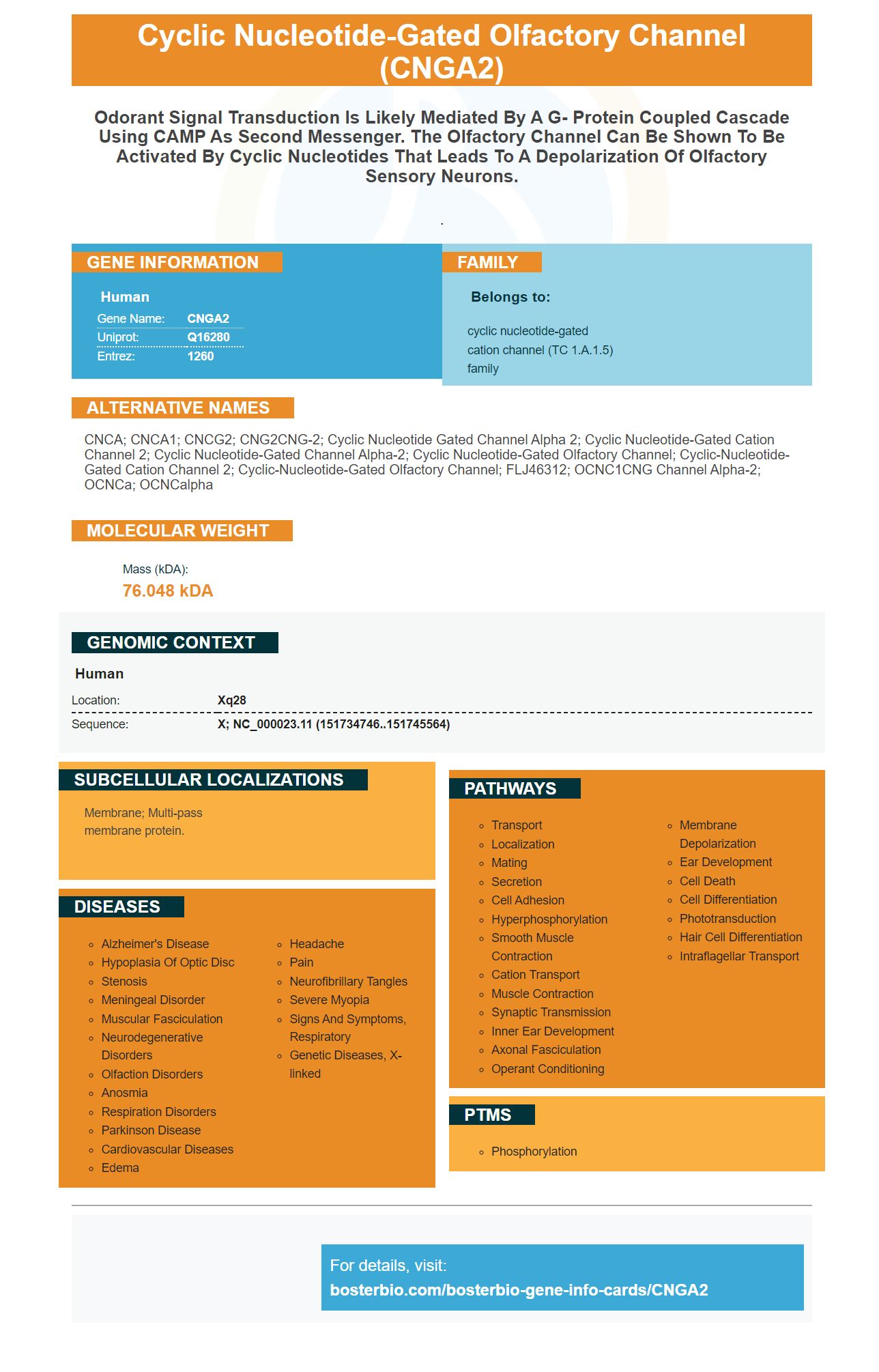 CNCA; CNCA1; CNCG2; CNG2CNG-2; cyclic nucleotide gated channel alpha 2; Cyclic nucleotide-gated cation channel 2; Cyclic nucleotide-gated channel alpha-2; cyclic nucleotide-gated olfactory channel; cyclic-nucleotide-gated cation channel 2; cyclic-nucleotide-gated olfactory channel; FLJ46312; OCNC1CNG channel alpha-2; OCNCa; OCNCalpha