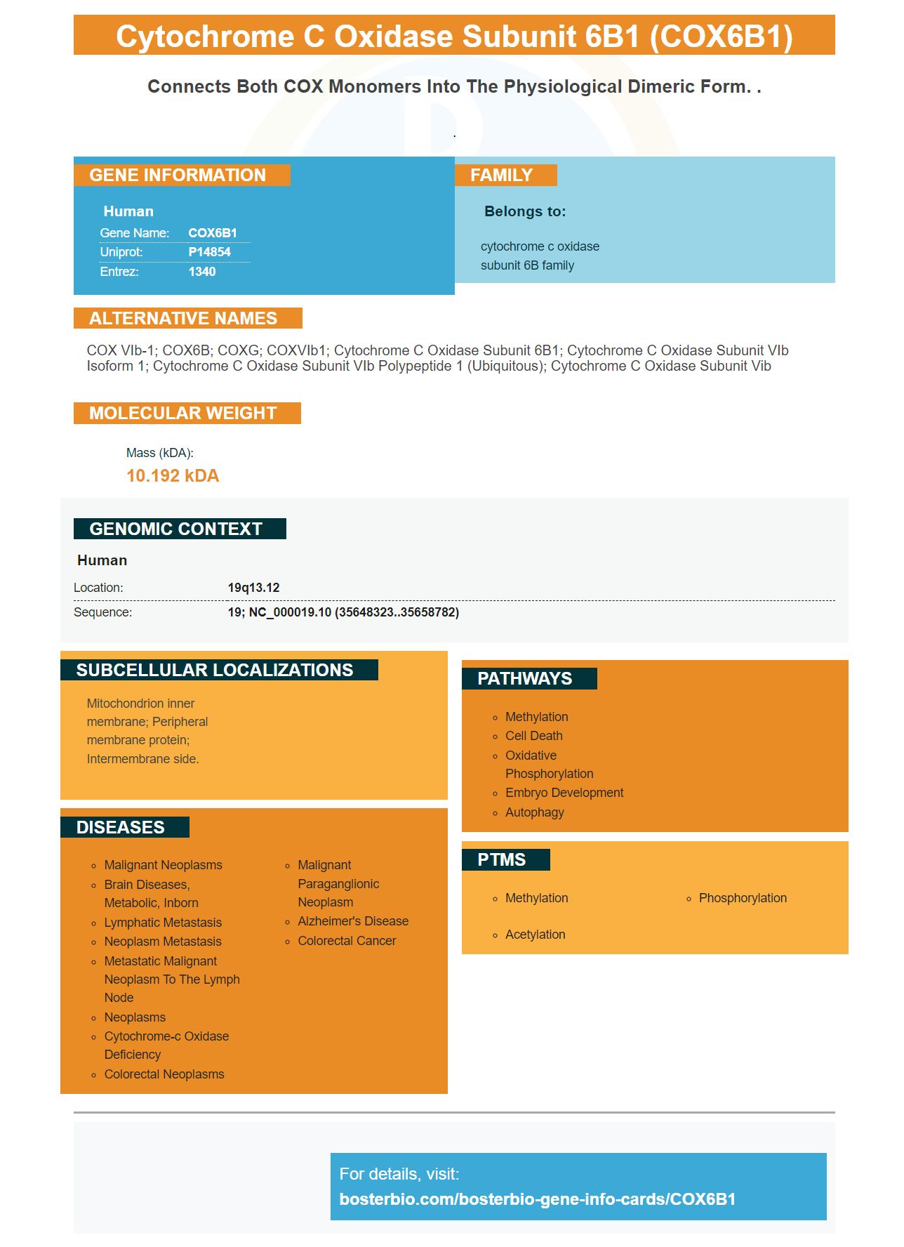 COX VIb-1; COX6B; COXG; COXVIb1; cytochrome c oxidase subunit 6B1; Cytochrome c oxidase subunit VIb isoform 1; cytochrome c oxidase subunit VIb polypeptide 1 (ubiquitous); cytochrome c oxidase subunit Vib