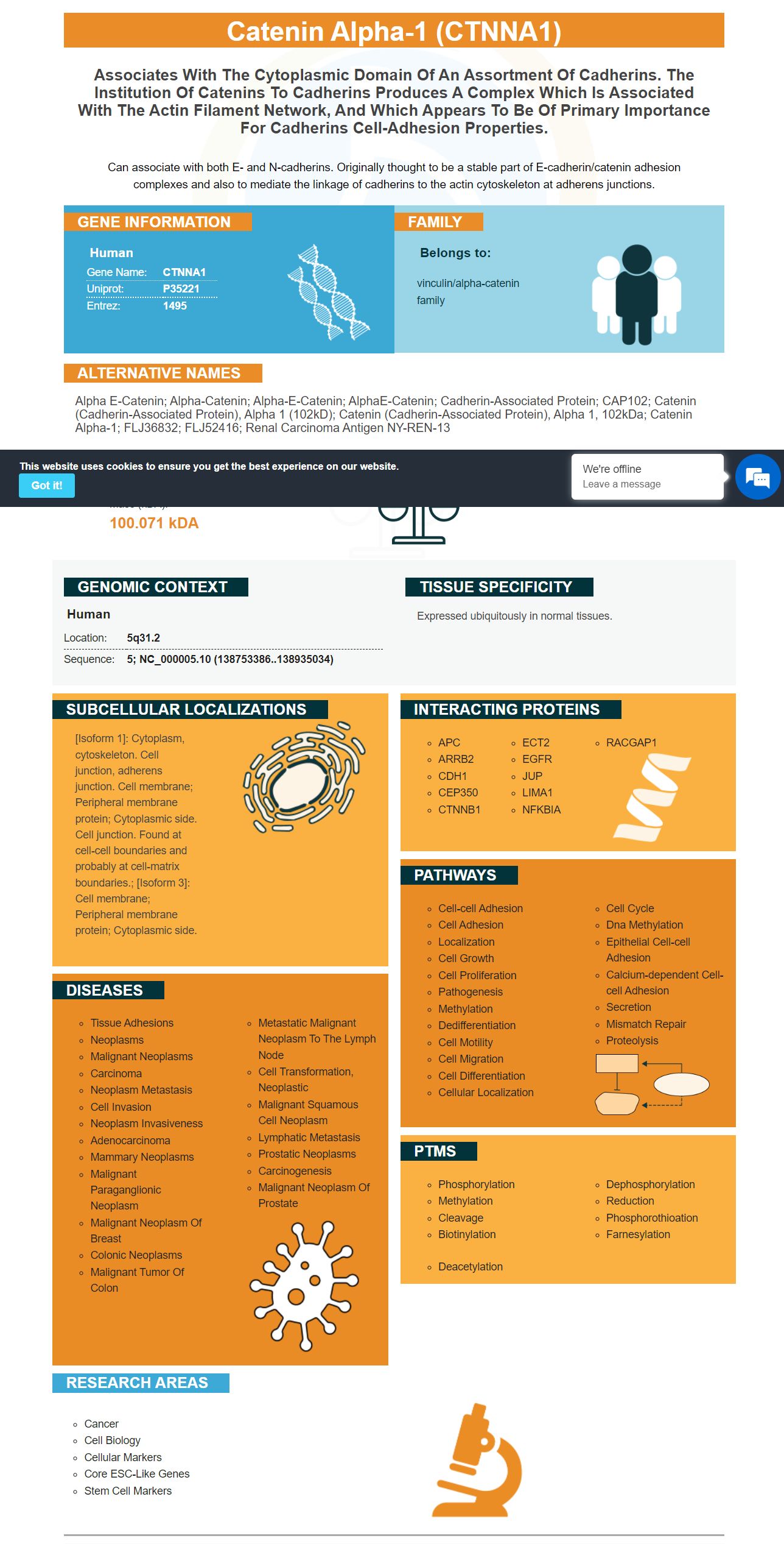 Alpha E-catenin; alpha-catenin; alpha-E-catenin; alphaE-catenin; cadherin-associated protein; CAP102; catenin (cadherin-associated protein), alpha 1 (102kD); catenin (cadherin-associated protein), alpha 1, 102kDa; catenin alpha-1; FLJ36832; FLJ52416; Renal carcinoma antigen NY-REN-13