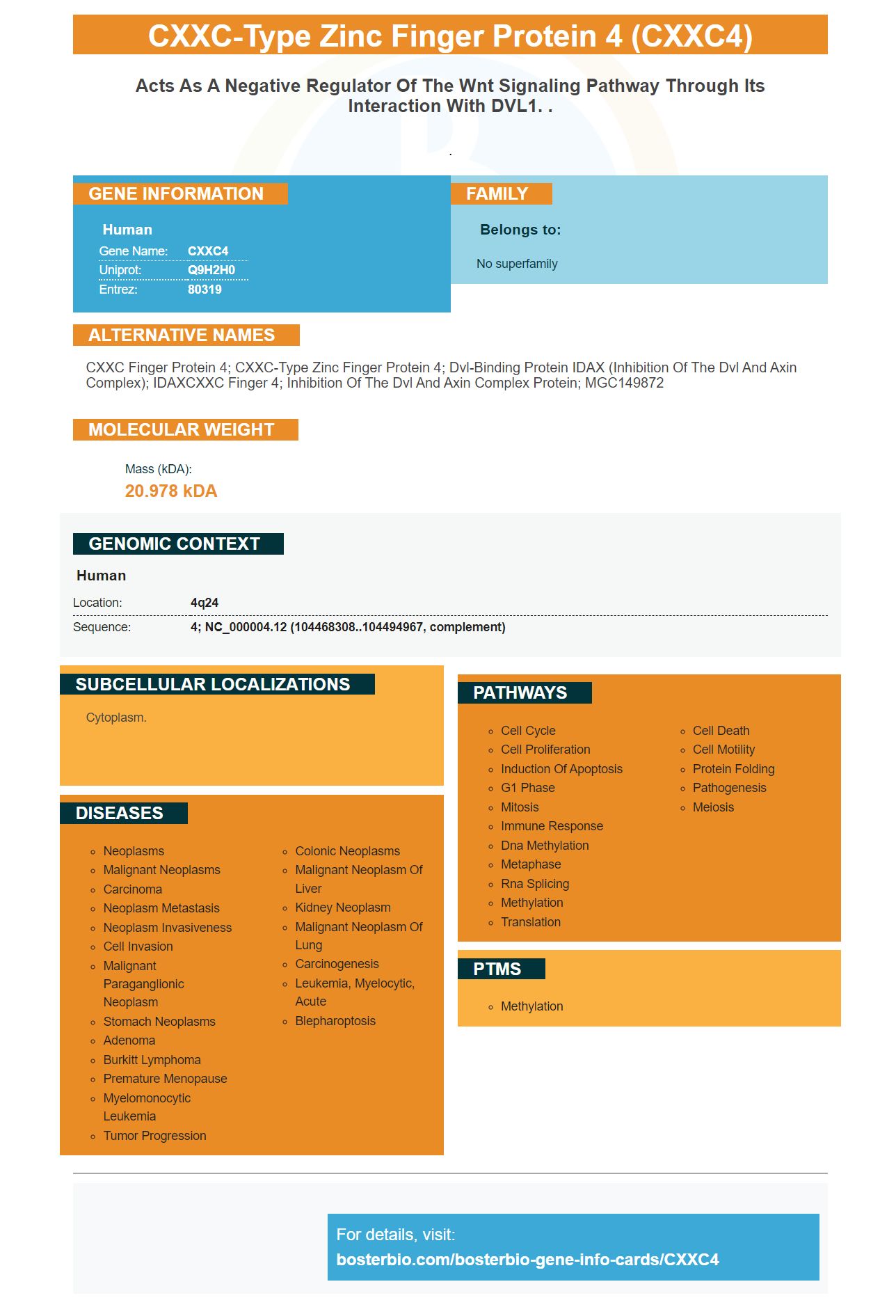 CXXC finger protein 4; CXXC-type zinc finger protein 4; Dvl-binding protein IDAX (inhibition of the Dvl and Axin complex); IDAXCXXC finger 4; Inhibition of the Dvl and axin complex protein; MGC149872