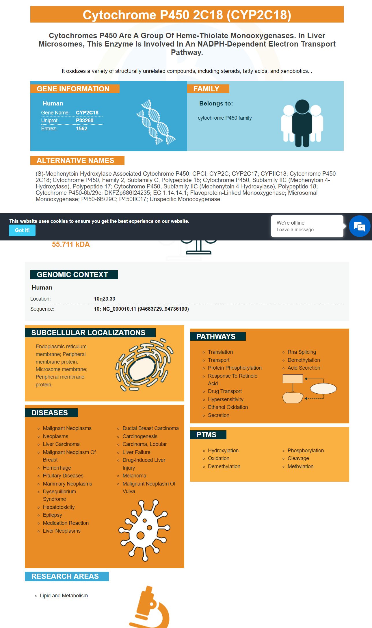 (S)-mephenytoin hydroxylase associated cytochrome P450; CPCI; CYP2C; CYP2C17; CYPIIC18; cytochrome P450 2C18; cytochrome P450, family 2, subfamily C, polypeptide 18; cytochrome P450, subfamily IIC (mephenytoin 4-hydroxylase), polypeptide 17; cytochrome P450, subfamily IIC (mephenytoin 4-hydroxylase), polypeptide 18; Cytochrome P450-6b/29c; DKFZp686I24235; EC 1.14.14.1; flavoprotein-linked monooxygenase; microsomal monooxygenase; P450-6B/29C; P450IIC17; unspecific monooxygenase