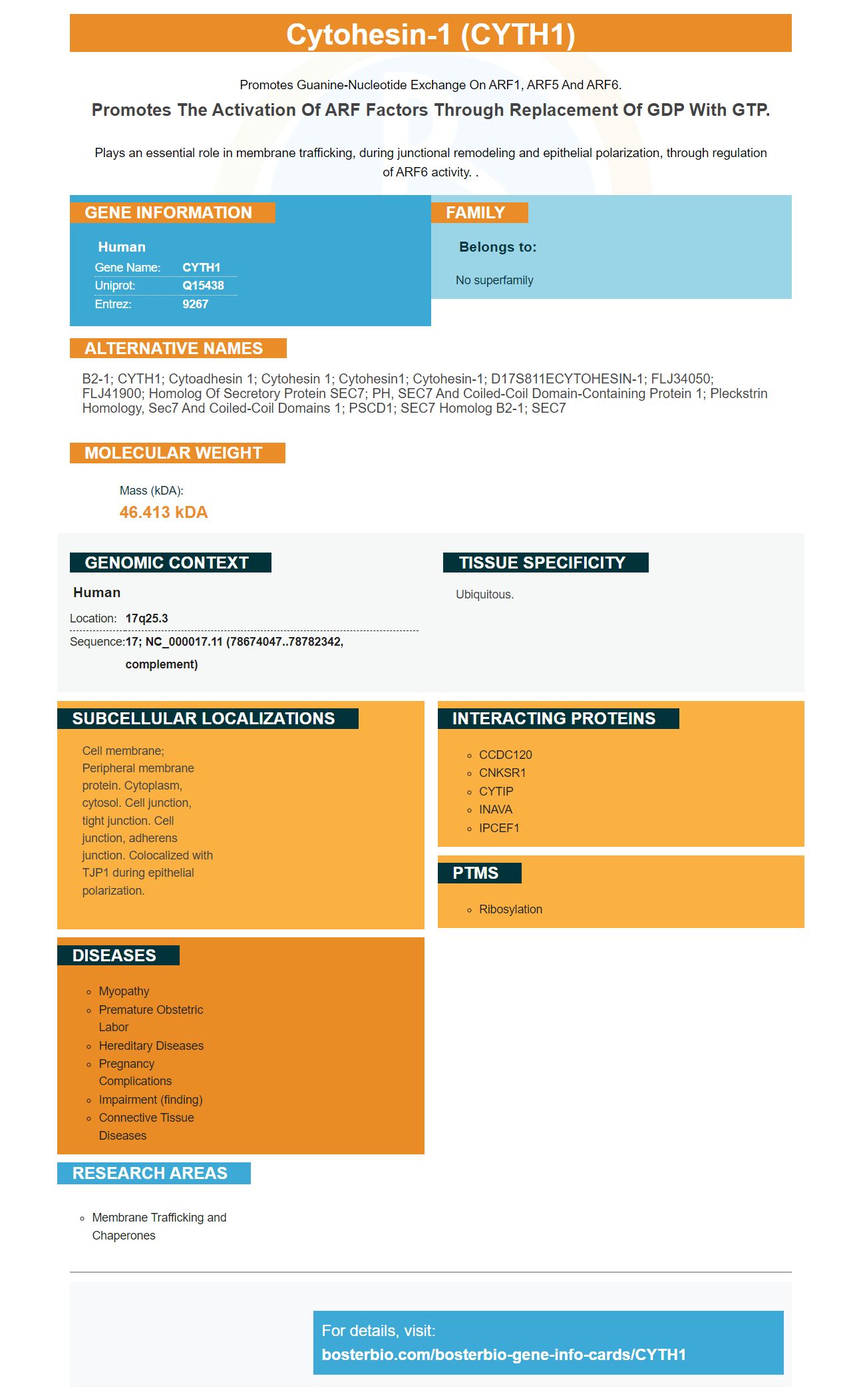 B2-1; CYTH1; cytoadhesin 1; cytohesin 1; Cytohesin1; Cytohesin-1; D17S811ECYTOHESIN-1; FLJ34050; FLJ41900; homolog of secretory protein SEC7; PH, SEC7 and coiled-coil domain-containing protein 1; pleckstrin homology, Sec7 and coiled-coil domains 1; PSCD1; SEC7 homolog B2-1; SEC7