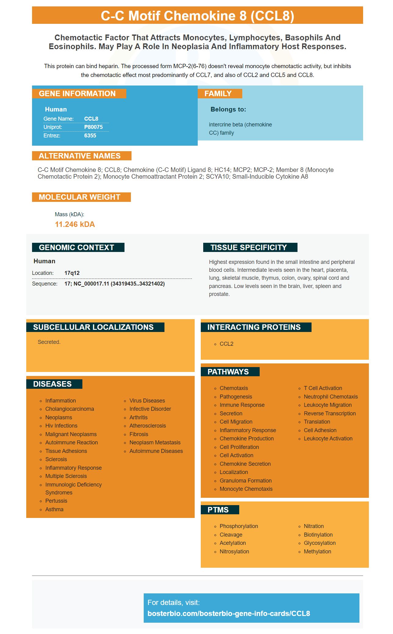 C-C motif chemokine 8; CCL8; chemokine (C-C motif) ligand 8; HC14; MCP2; MCP-2; member 8 (monocyte chemotactic protein 2); monocyte chemoattractant protein 2; SCYA10; small-inducible cytokine A8