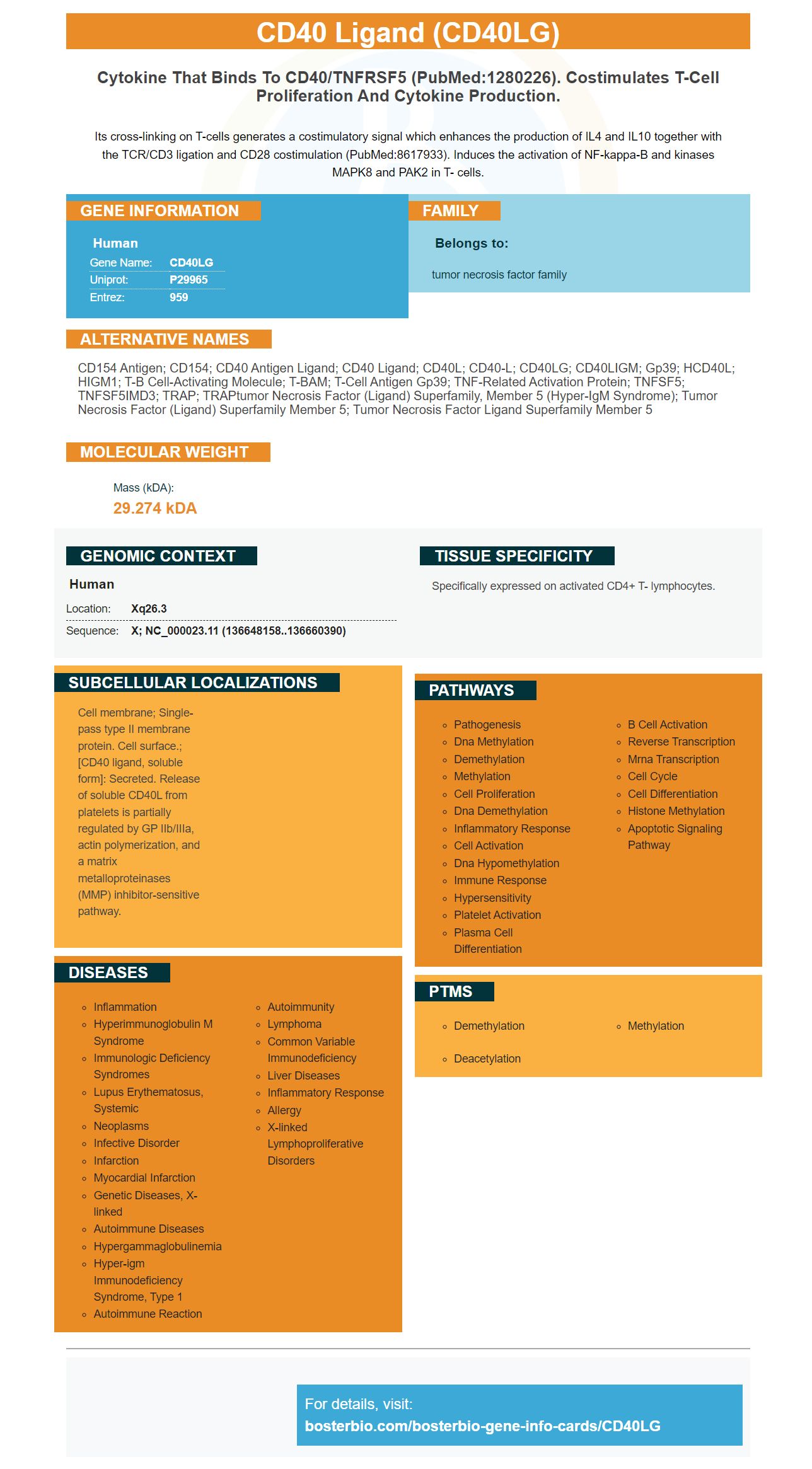 CD154 antigen; CD154; CD40 antigen ligand; CD40 Ligand; CD40L; CD40-L; CD40LG; CD40LIGM; gp39; hCD40L; HIGM1; T-B cell-activating molecule; T-BAM; T-cell antigen Gp39; TNF-related activation protein; TNFSF5; TNFSF5IMD3; TRAP; TRAPtumor necrosis factor (ligand) superfamily, member 5 (hyper-IgM syndrome); tumor necrosis factor (ligand) superfamily member 5; Tumor necrosis factor ligand superfamily member 5