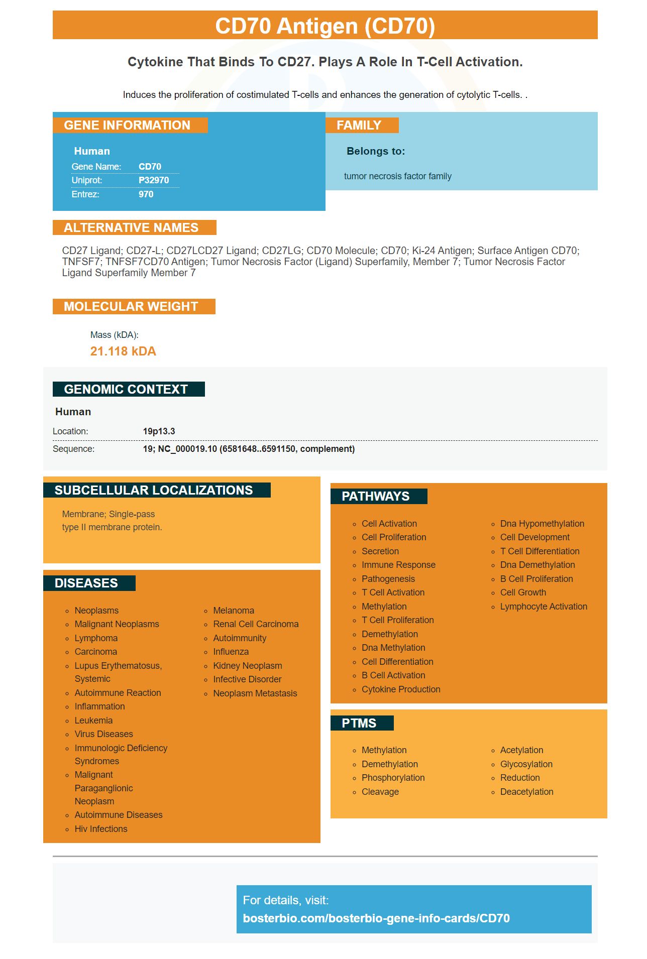 CD27 Ligand; CD27-L; CD27LCD27 ligand; CD27LG; CD70 molecule; CD70; Ki-24 antigen; surface antigen CD70; TNFSF7; TNFSF7CD70 antigen; tumor necrosis factor (ligand) superfamily, member 7; Tumor necrosis factor ligand superfamily member 7