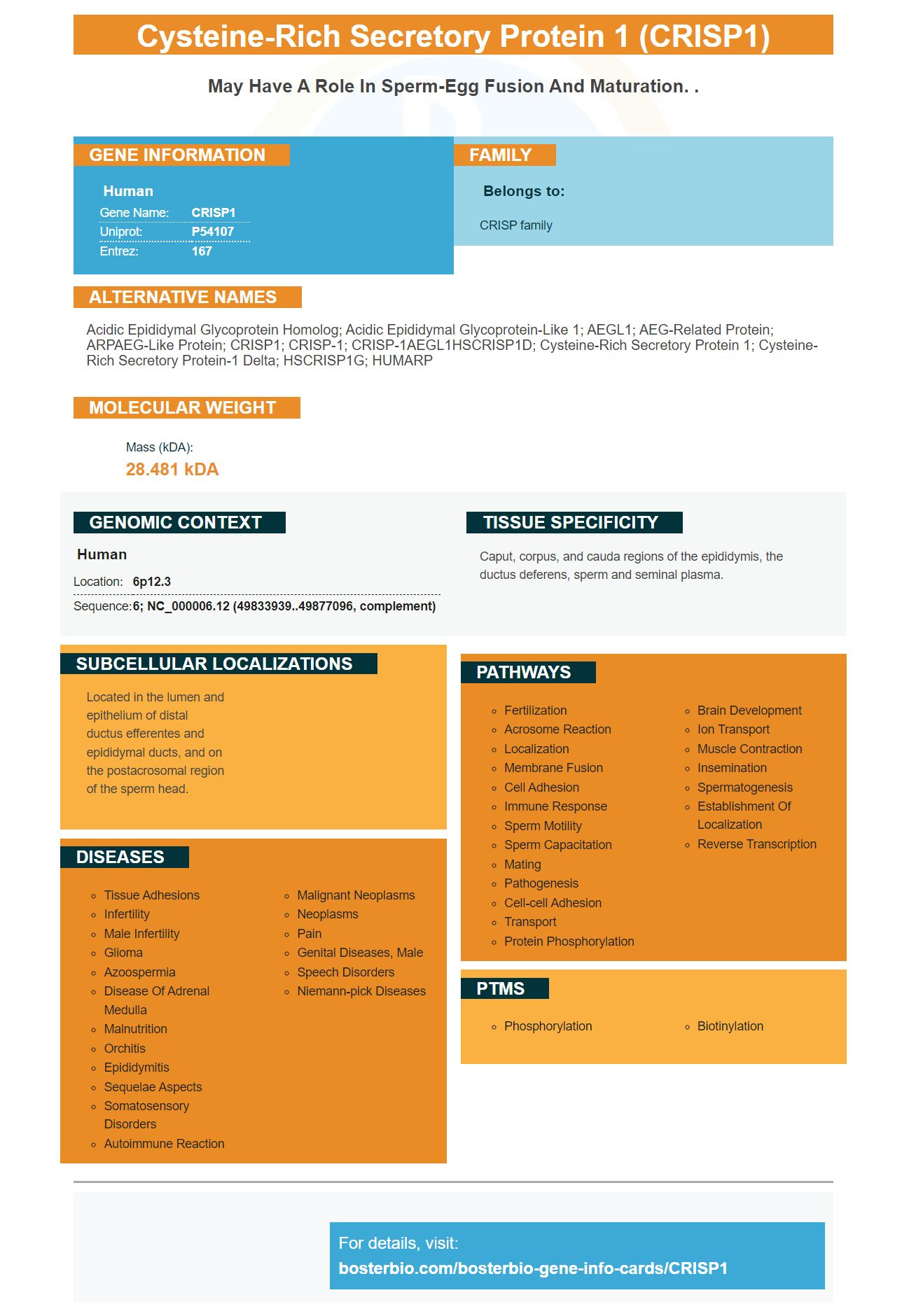 Acidic epididymal glycoprotein homolog; acidic epididymal glycoprotein-like 1; AEGL1; AEG-related protein; ARPAEG-like protein; CRISP1; CRISP-1; CRISP-1AEGL1HSCRISP1D; cysteine-rich secretory protein 1; cysteine-rich secretory protein-1 delta; HSCRISP1G; HUMARP