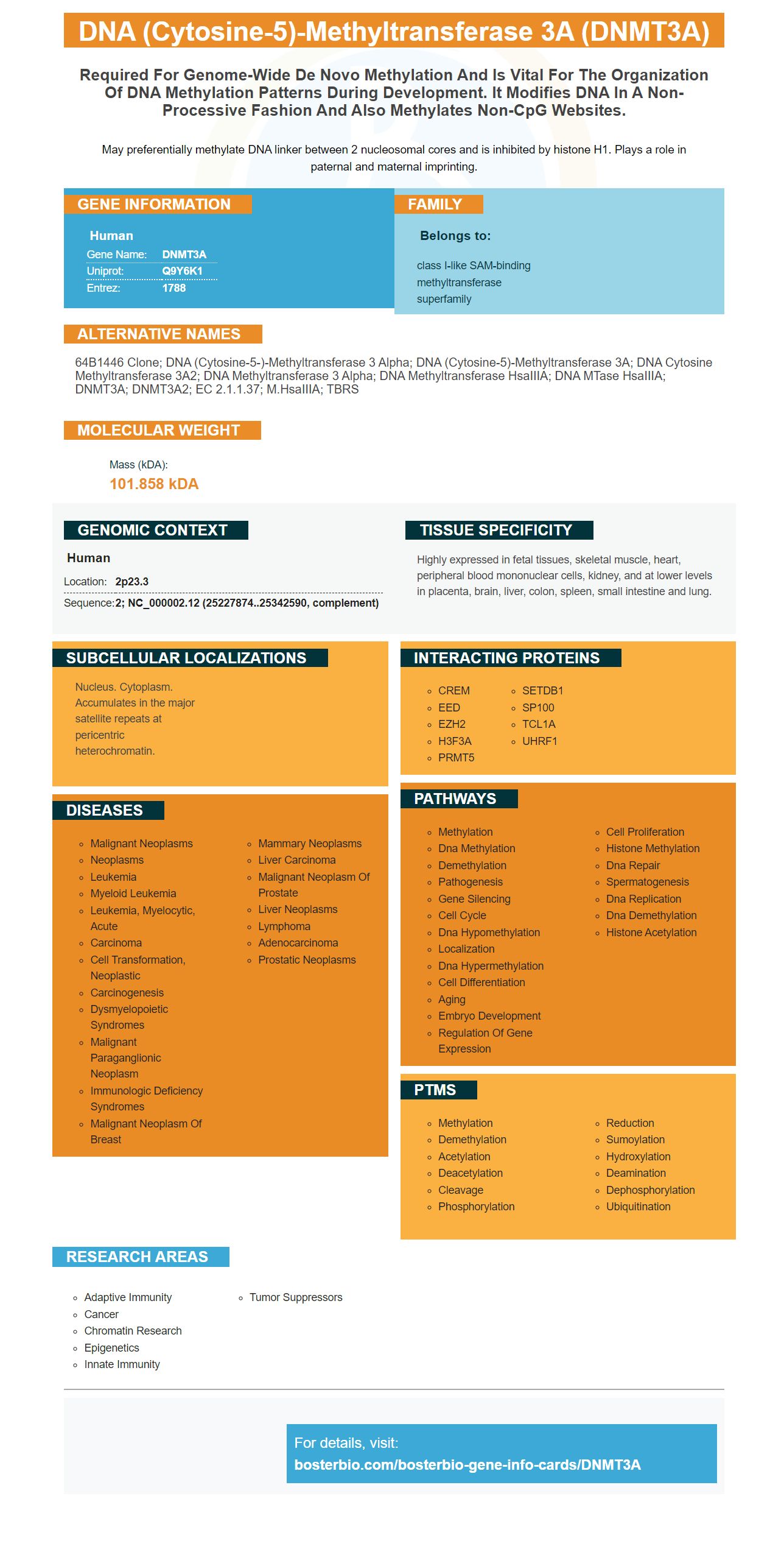 64B1446 clone; DNA (cytosine-5-)-methyltransferase 3 alpha; DNA (cytosine-5)-methyltransferase 3A; DNA cytosine methyltransferase 3A2; DNA Methyltransferase 3 Alpha; DNA methyltransferase HsaIIIA; DNA MTase HsaIIIA; DNMT3A; DNMT3A2; EC 2.1.1.37; M.HsaIIIA; TBRS