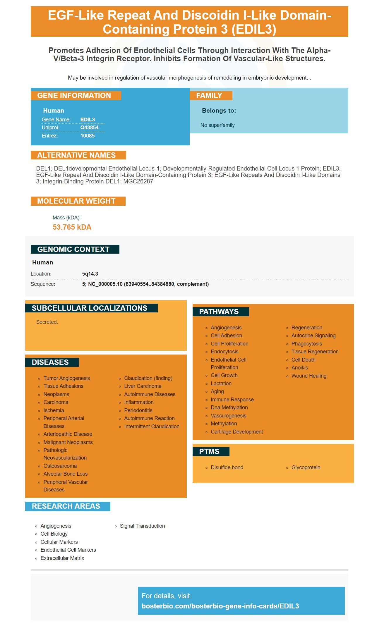 DEL1; DEL1developmental endothelial locus-1; Developmentally-regulated endothelial cell locus 1 protein; EDIL3; EGF-like repeat and discoidin I-like domain-containing protein 3; EGF-like repeats and discoidin I-like domains 3; Integrin-binding protein DEL1; MGC26287