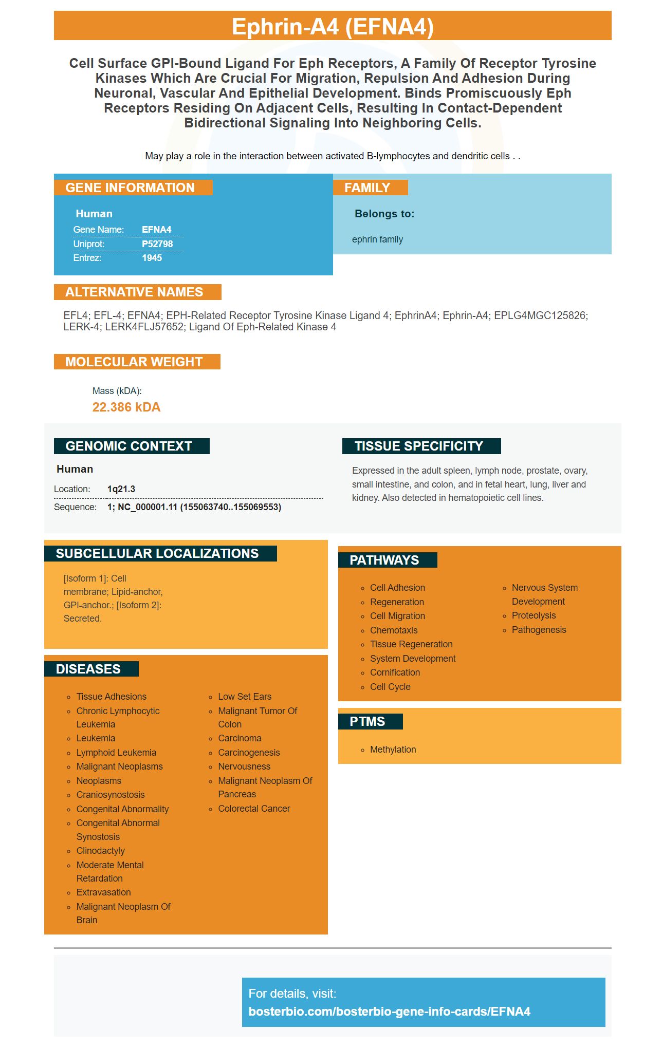 EFL4; EFL-4; EFNA4; EPH-related receptor tyrosine kinase ligand 4; EphrinA4; Ephrin-A4; EPLG4MGC125826; LERK-4; LERK4FLJ57652; ligand of eph-related kinase 4