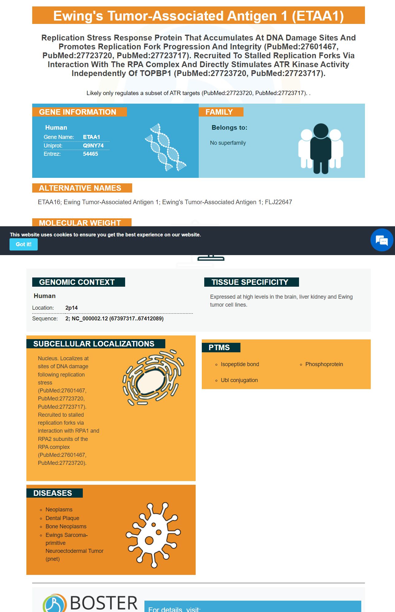 PMID: 27601467 by Feng S., et al. Ewing Tumor-associated Antigen 1 interacts with replication protein A to promote restart of stalled replication forks.