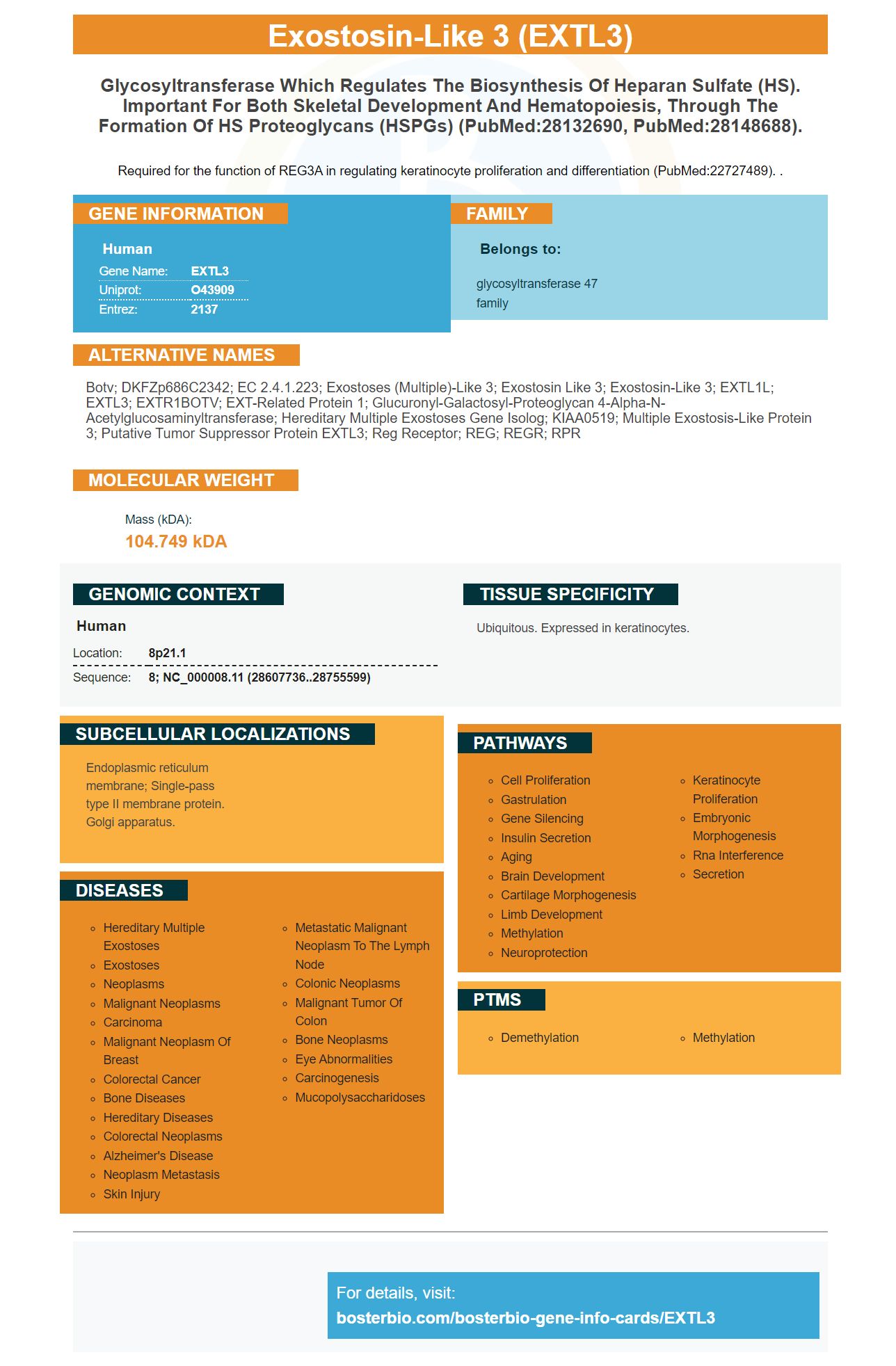 botv; DKFZp686C2342; EC 2.4.1.223; exostoses (multiple)-like 3; Exostosin like 3; Exostosin-like 3; EXTL1L; EXTL3; EXTR1BOTV; EXT-related protein 1; Glucuronyl-galactosyl-proteoglycan 4-alpha-N-acetylglucosaminyltransferase; Hereditary multiple exostoses gene isolog; KIAA0519; Multiple exostosis-like protein 3; Putative tumor suppressor protein EXTL3; reg receptor; REG; REGR; RPR