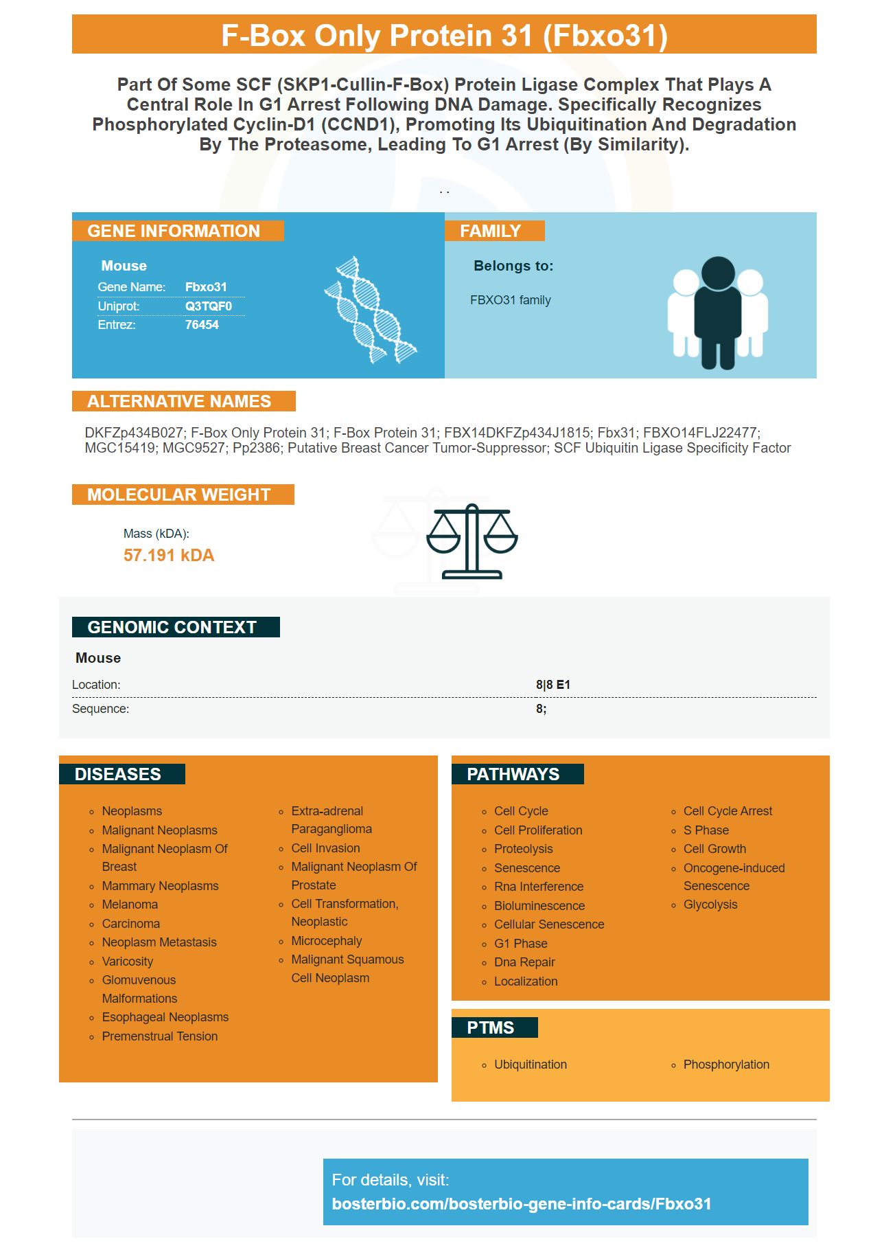 DKFZp434B027; F-box only protein 31; F-box protein 31; FBX14DKFZp434J1815; Fbx31; FBXO14FLJ22477; MGC15419; MGC9527; pp2386; putative breast cancer tumor-suppressor; SCF ubiquitin ligase specificity factor