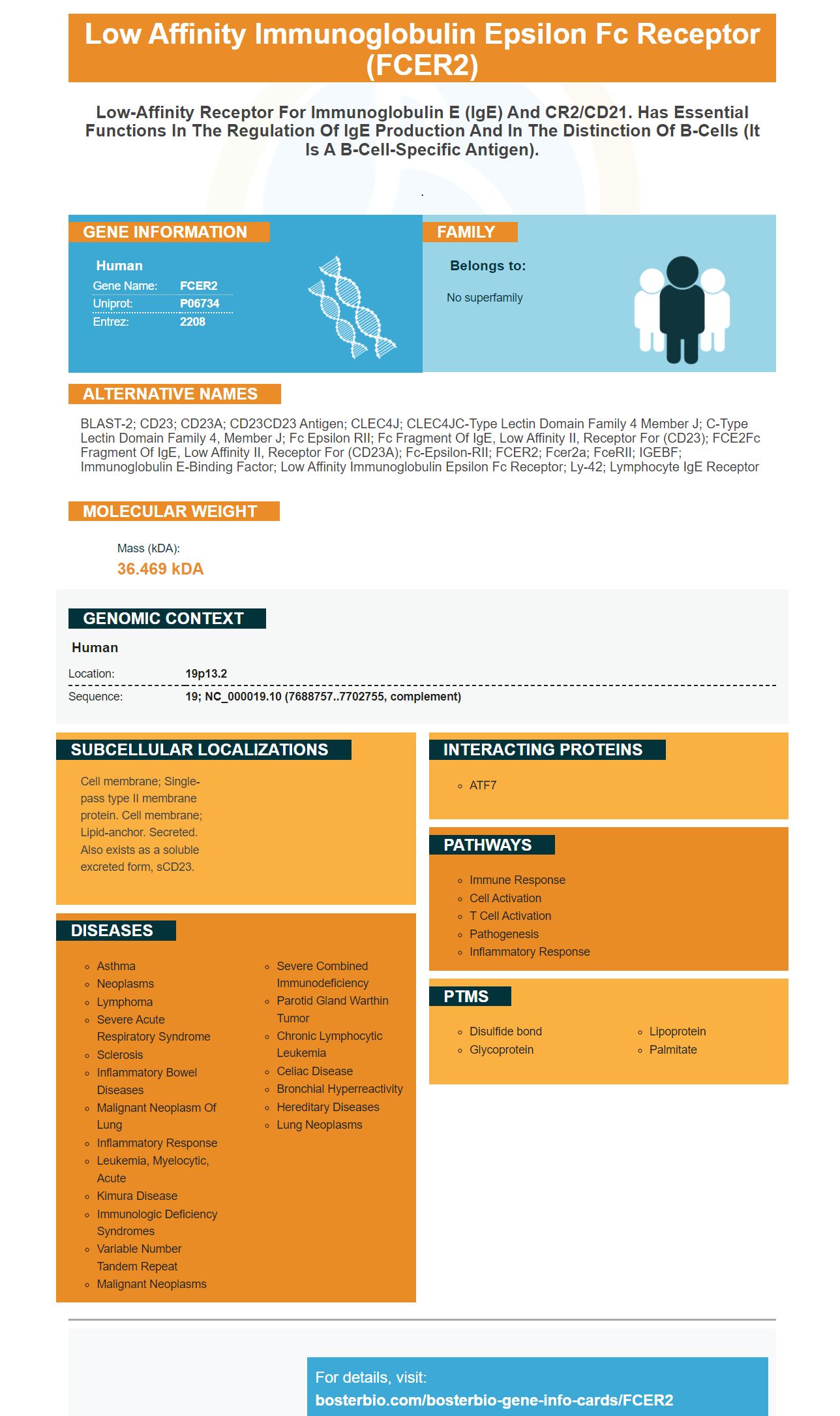 BLAST-2; CD23; CD23A; CD23CD23 antigen; CLEC4J; CLEC4JC-type lectin domain family 4 member J; C-type lectin domain family 4, member J; Fc epsilon RII; Fc fragment of IgE, low affinity II, receptor for (CD23); FCE2Fc fragment of IgE, low affinity II, receptor for (CD23A); fc-epsilon-RII; FCER2; Fcer2a; FceRII; IGEBF; Immunoglobulin E-binding factor; low affinity immunoglobulin epsilon Fc receptor; Ly-42; Lymphocyte IgE receptor