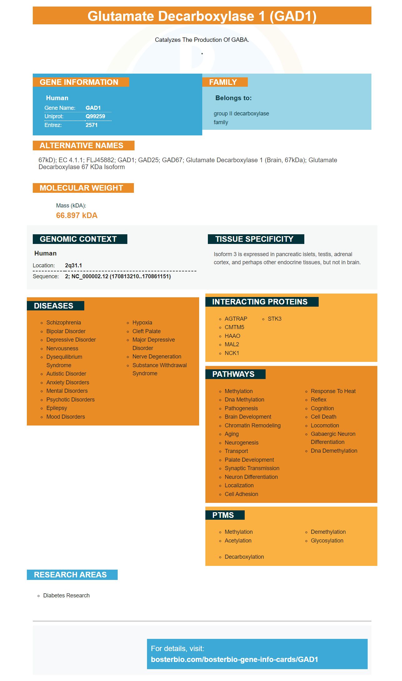 67kD); EC 4.1.1; FLJ45882; GAD1; GAD25; GAD67; glutamate decarboxylase 1 (brain, 67kDa); Glutamate decarboxylase 67 kDa isoform