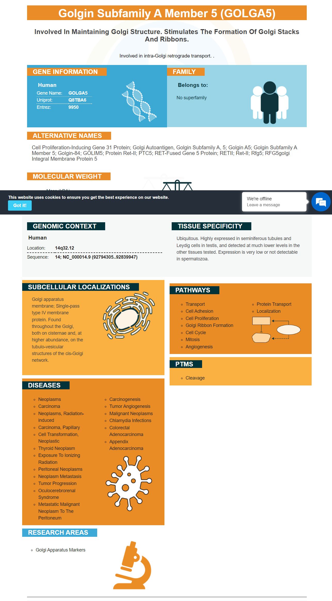Cell proliferation-inducing gene 31 protein; golgi autoantigen, golgin subfamily a, 5; golgin A5; Golgin subfamily A member 5; Golgin-84; GOLIM5; Protein Ret-II; PTC5; RET-fused gene 5 protein; RETII; ret-II; rfg5; RFG5golgi integral membrane protein 5