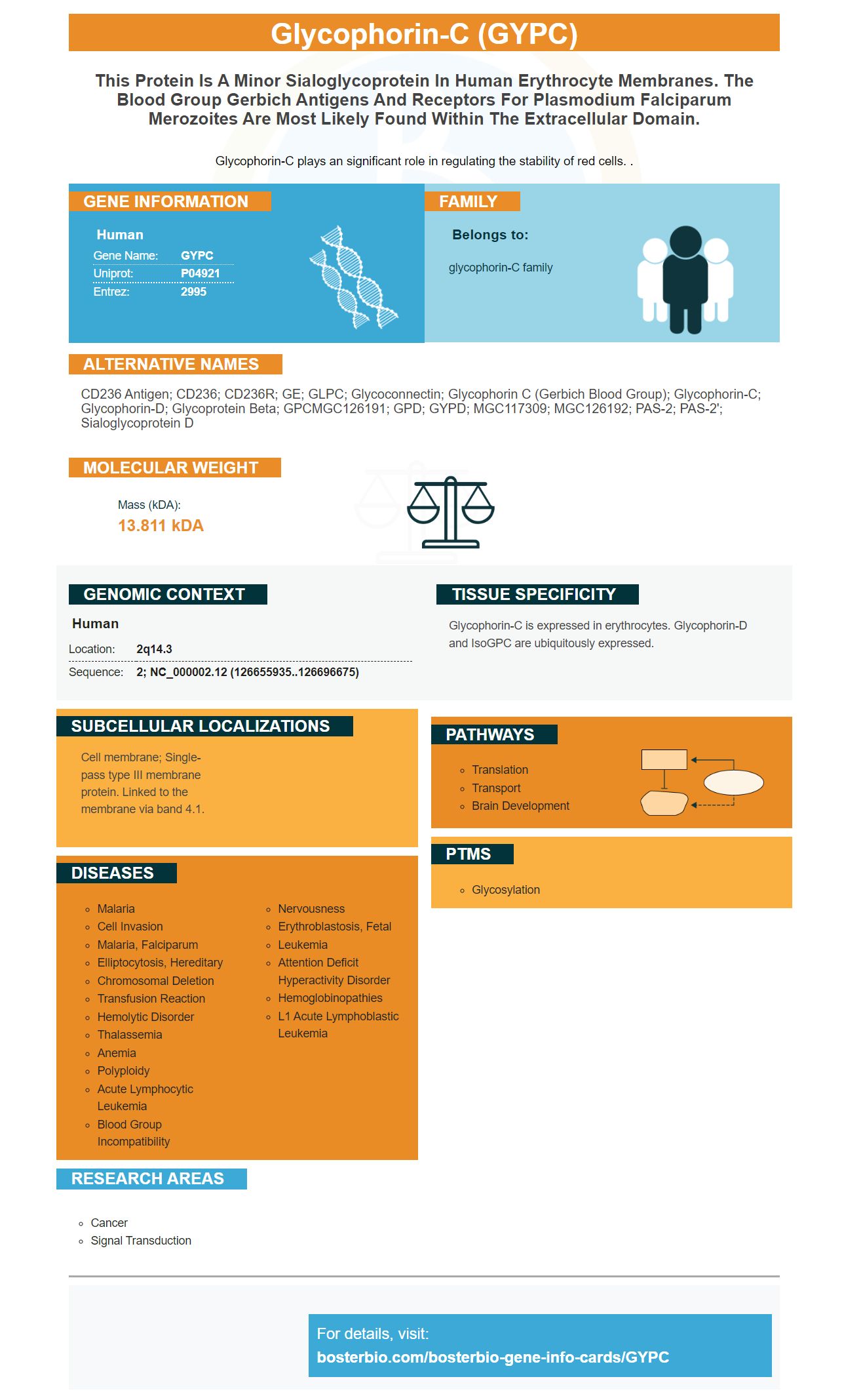CD236 antigen; CD236; CD236R; GE; GLPC; glycoconnectin; glycophorin C (Gerbich blood group); glycophorin-C; glycophorin-D; Glycoprotein beta; GPCMGC126191; GPD; GYPD; MGC117309; MGC126192; PAS-2; PAS-2'; Sialoglycoprotein D